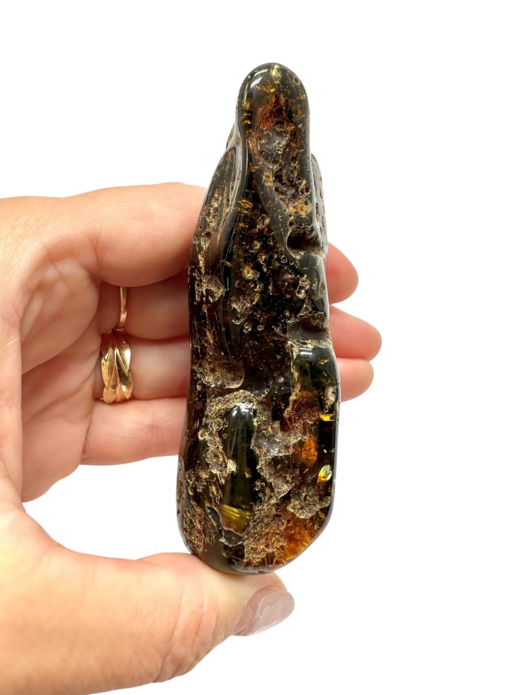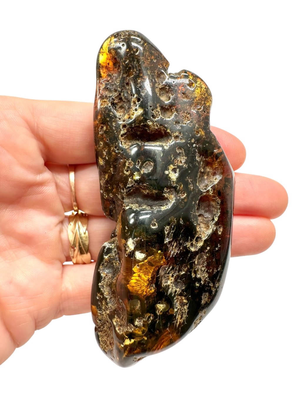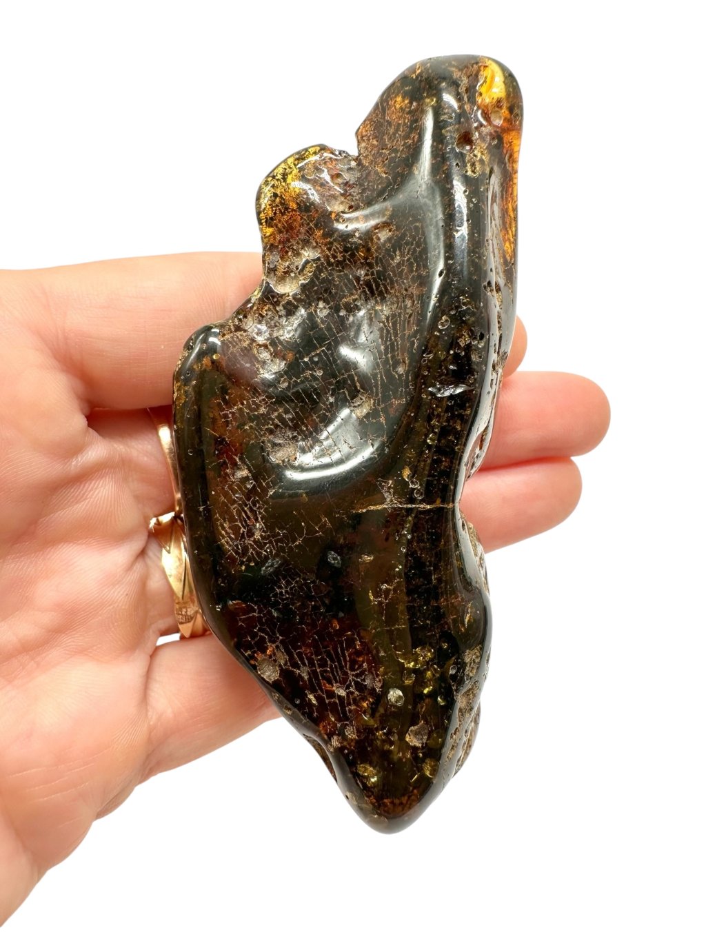Poznámka: Úvodní fotografie byla pořízena s jantarem drženým mezi prsty, takže skrz něj prochází světlo a působí světlejším dojmem, než když je položen na povrchu.