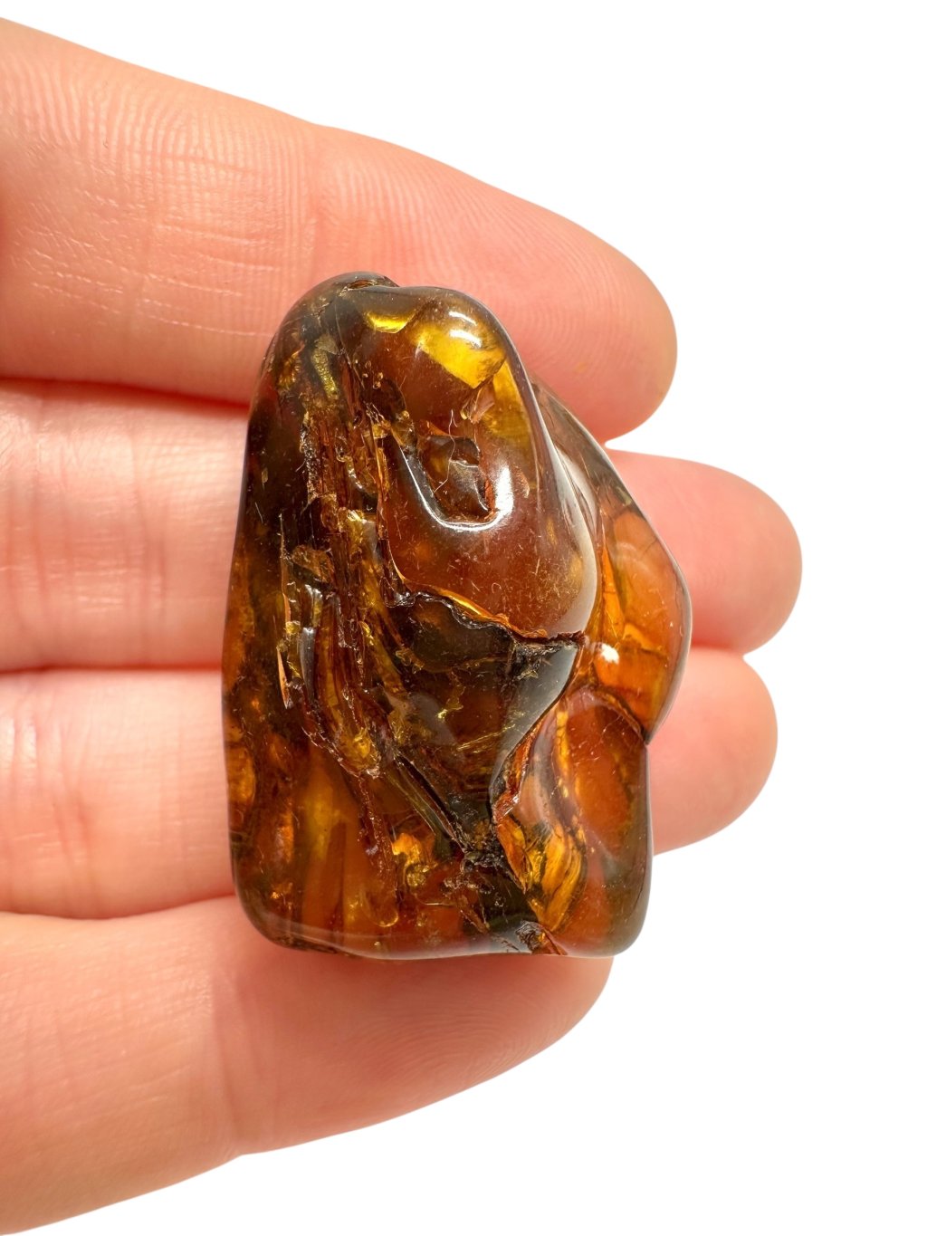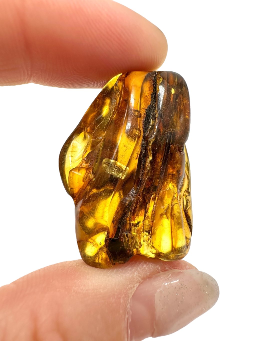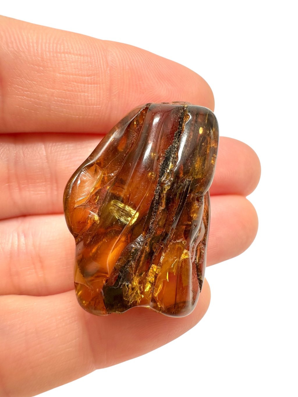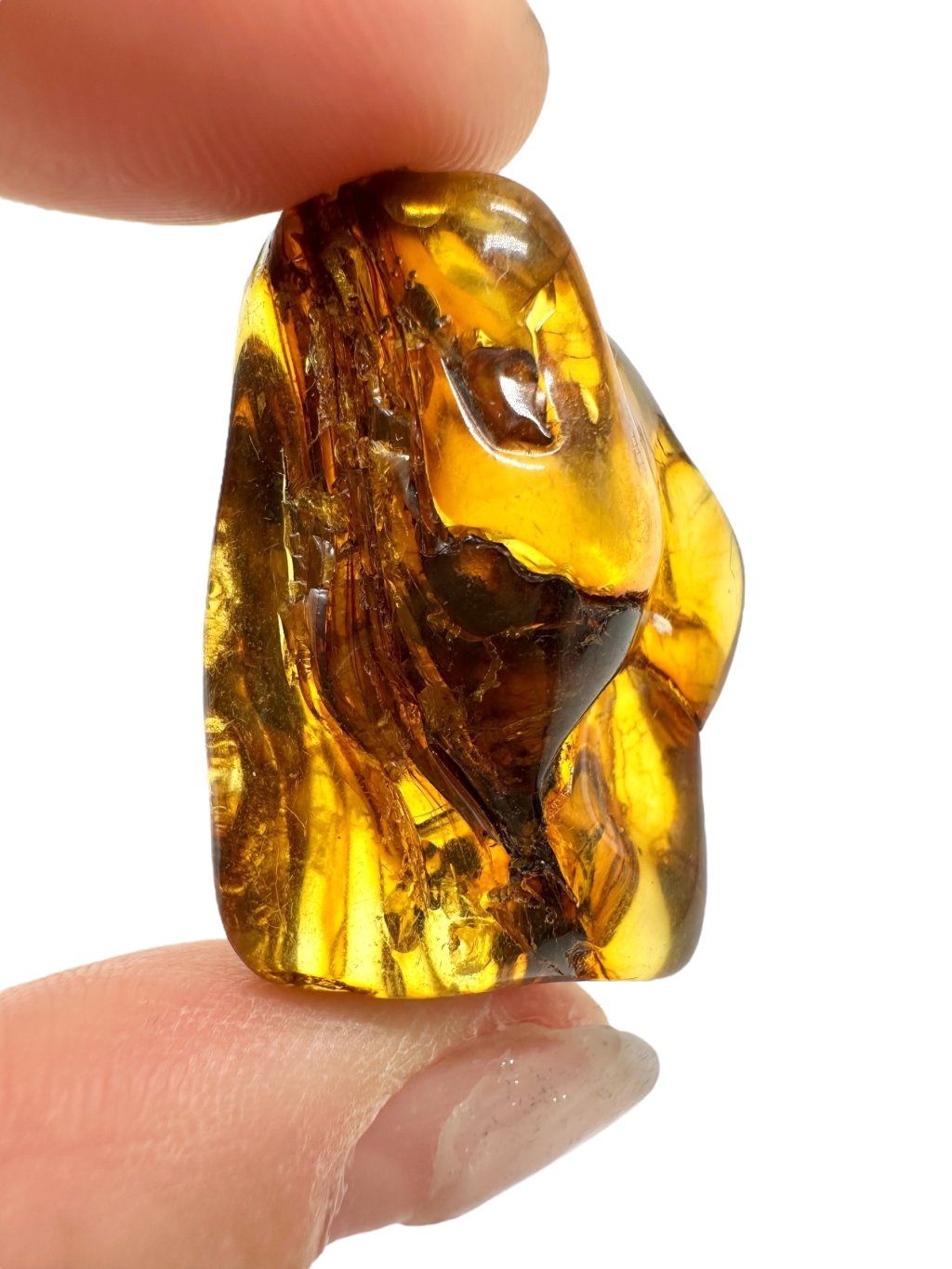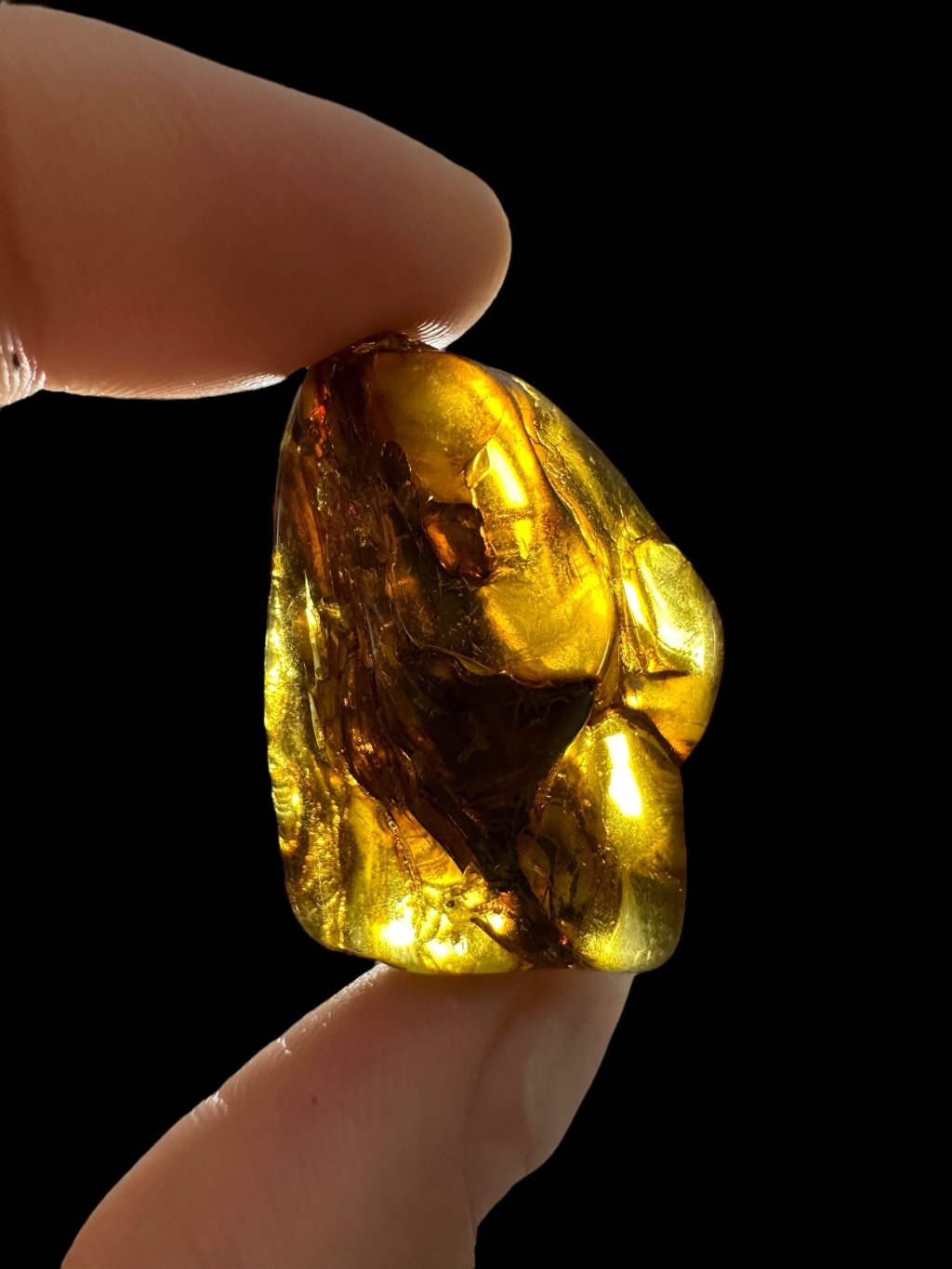 Poznámka: Úvodní fotografie byla pořízena s jantarem drženým mezi prsty, takže skrz něj prochází světlo a působí světlejším dojmem, než když je položen na povrchu.