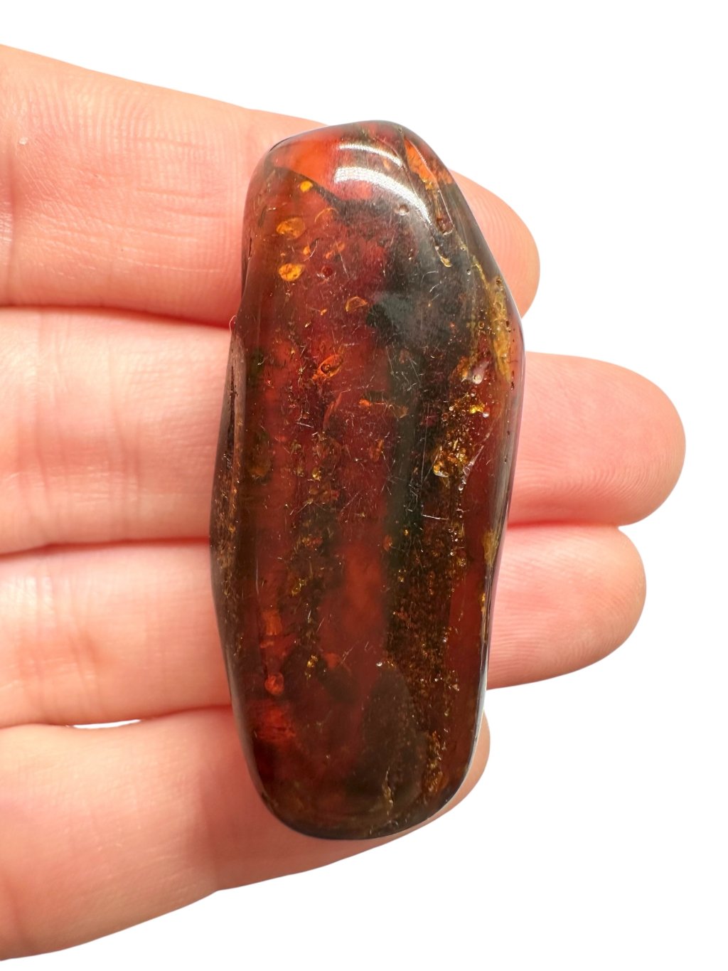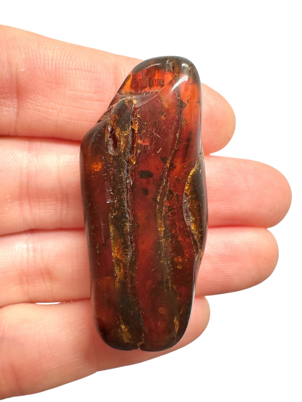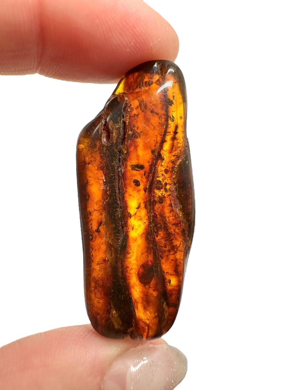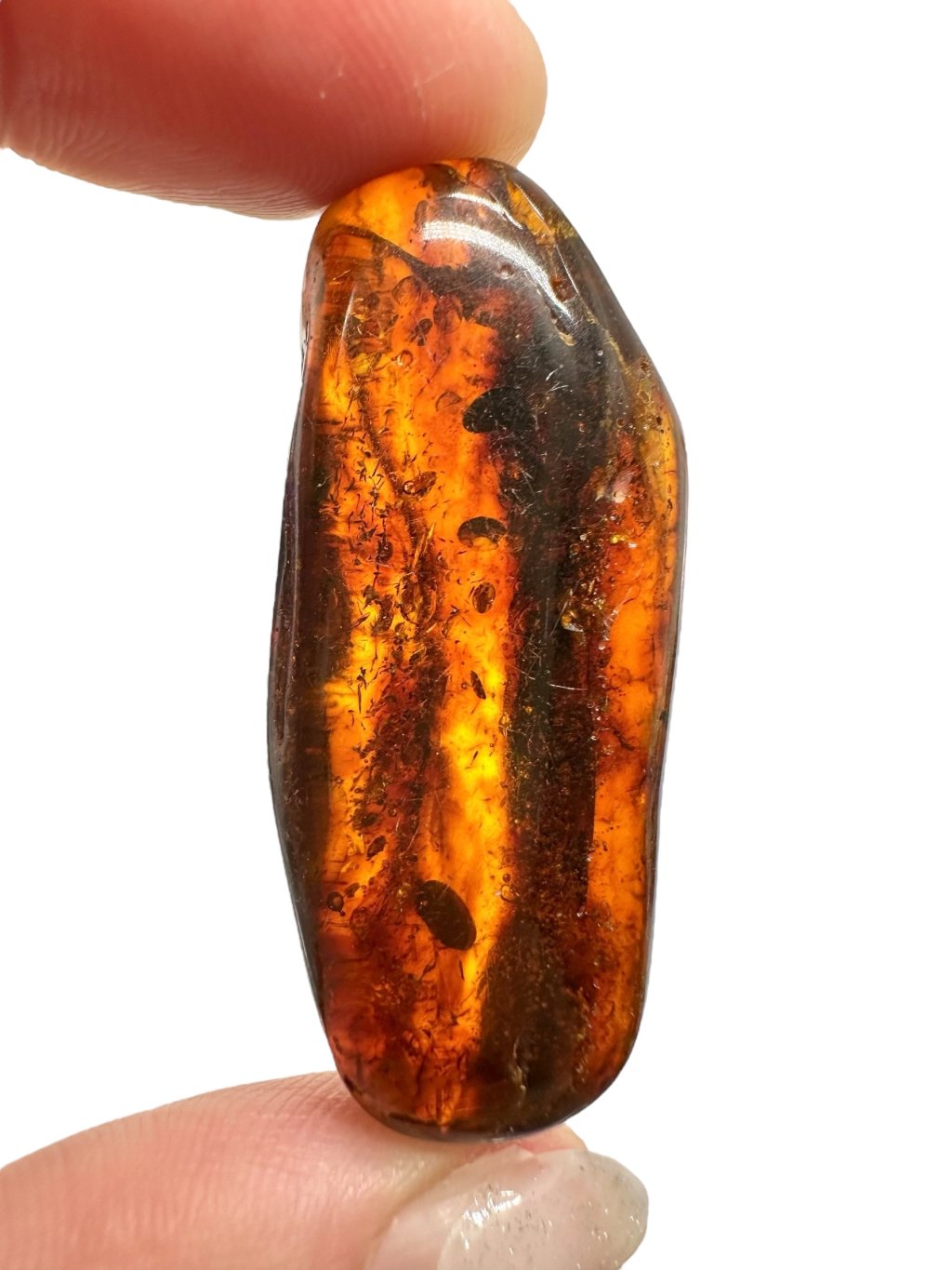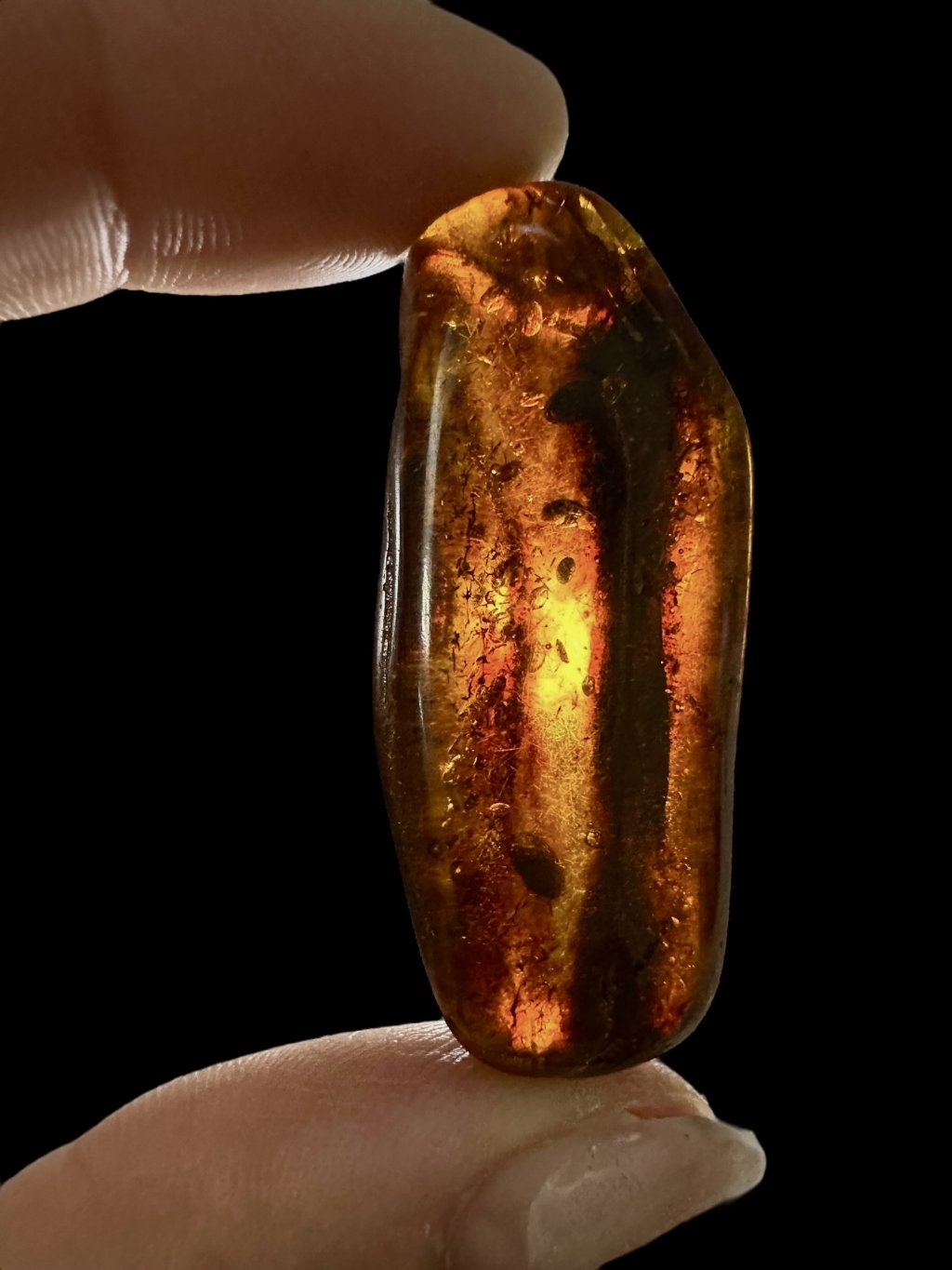 Poznámka: Úvodní fotografie byla pořízena s jantarem drženým mezi prsty, takže skrz něj prochází světlo a působí světlejším dojmem, než když je položen na povrchu.