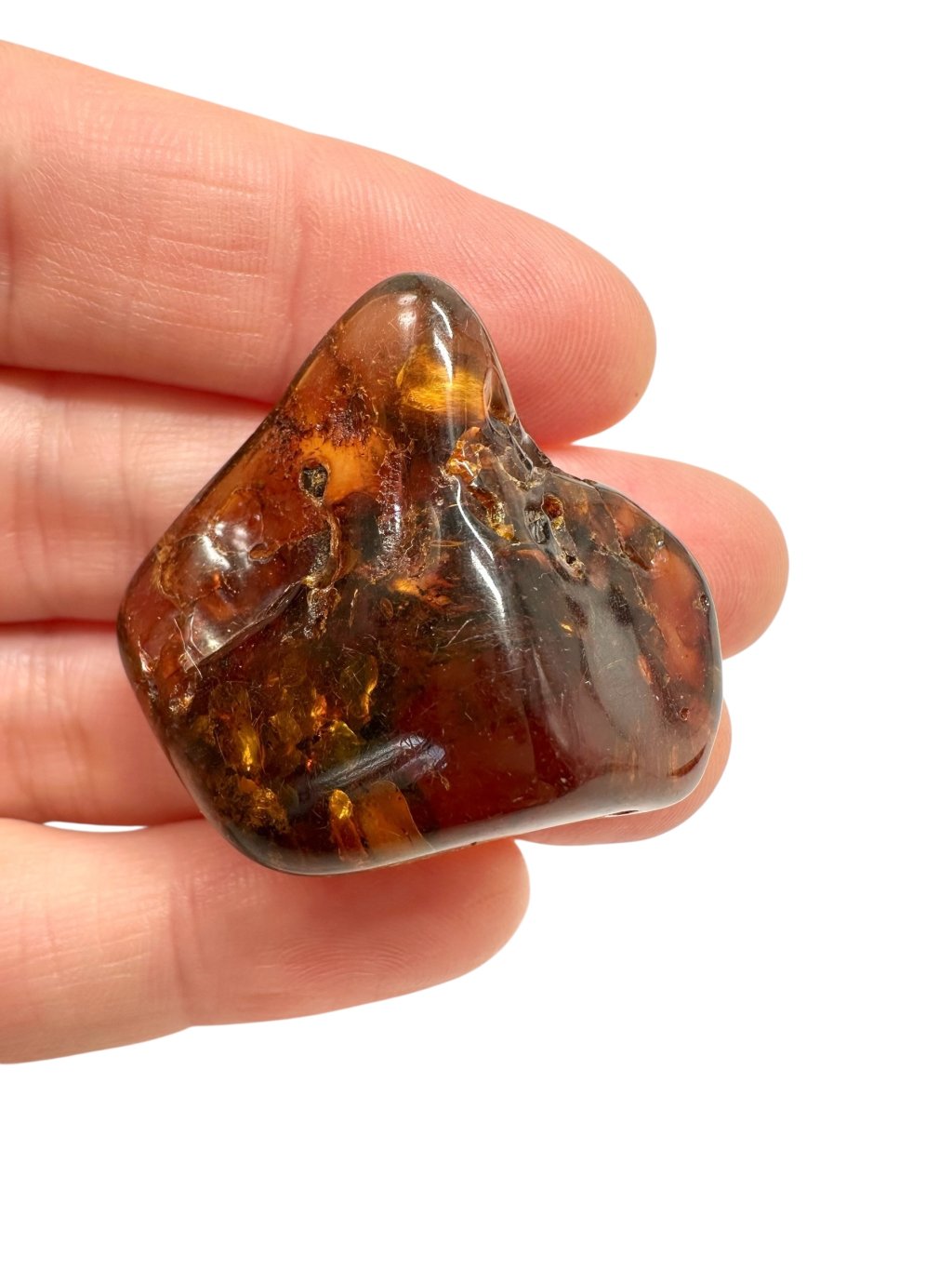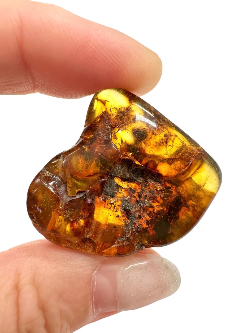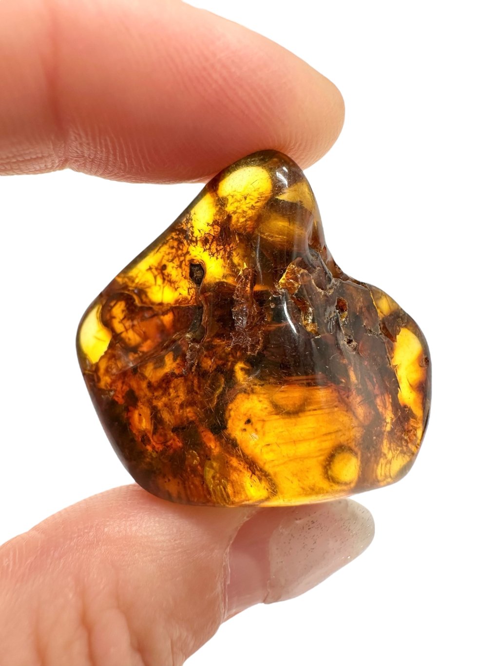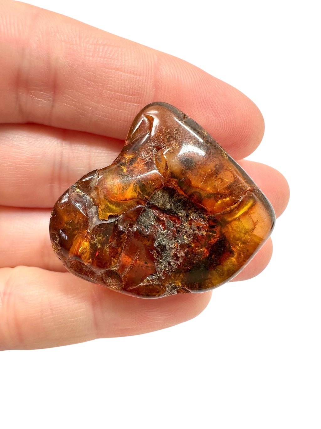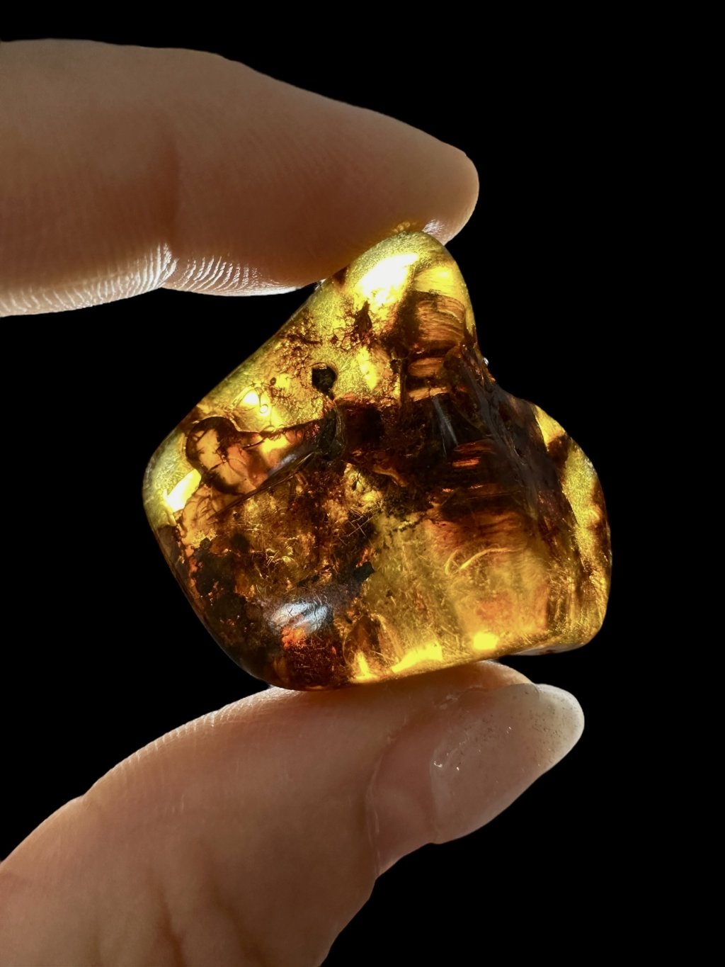 Poznámka: Úvodní fotografie byla pořízena s jantarem drženým mezi prsty, takže skrz něj prochází světlo a působí světlejším dojmem, než když je položen na povrchu.
