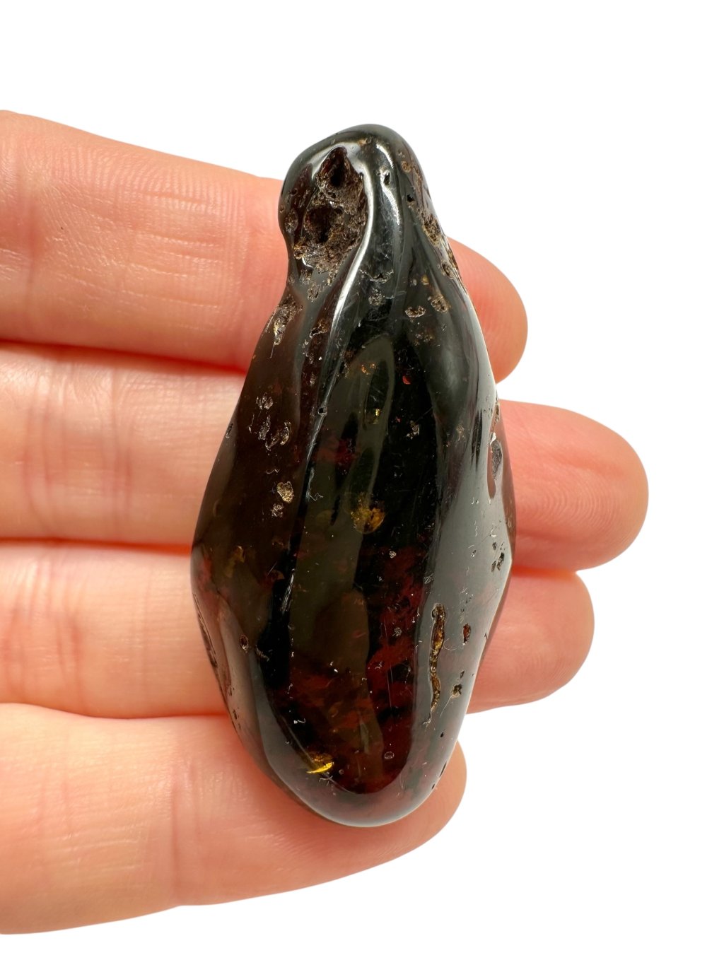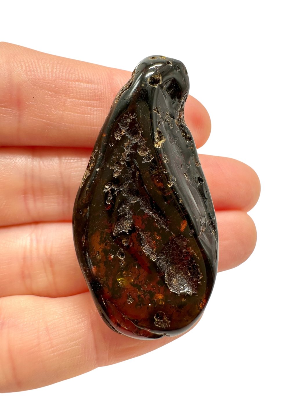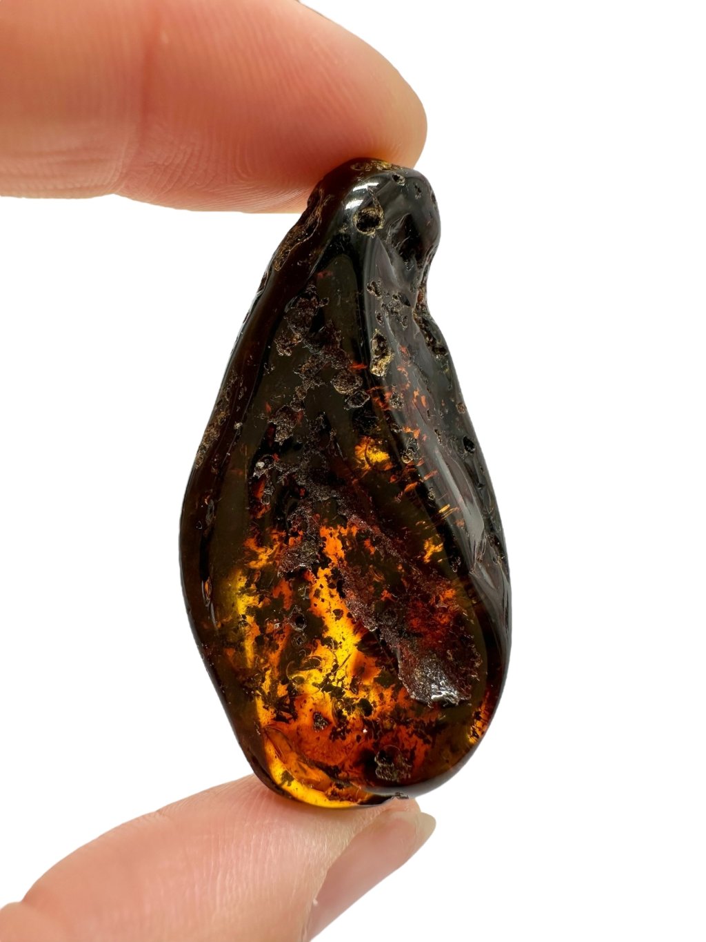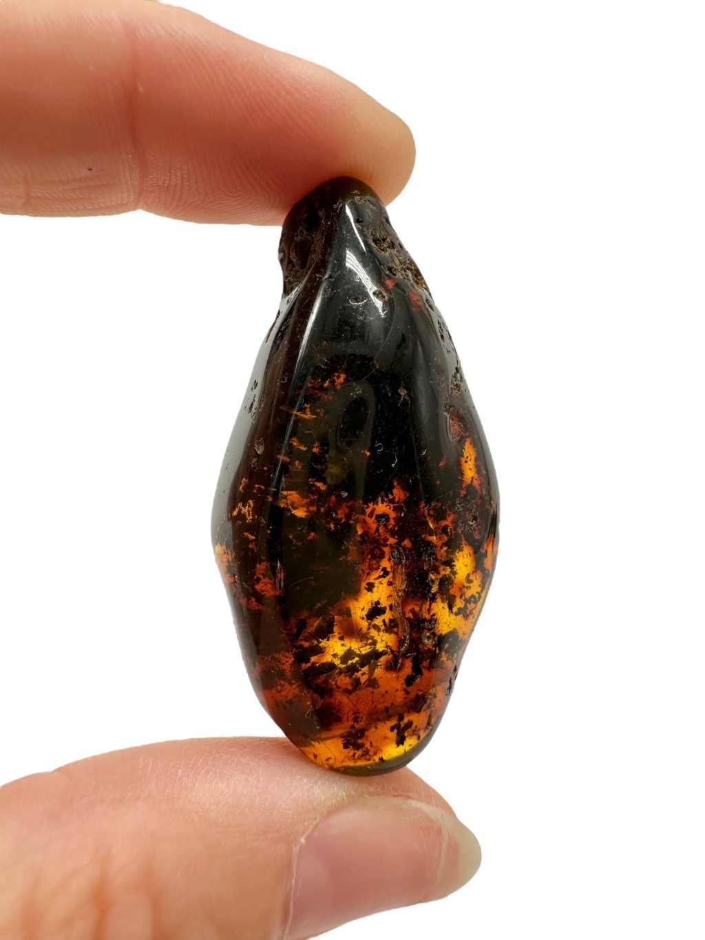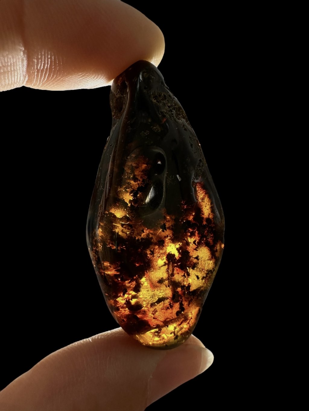 Poznámka: Úvodní fotografie byla pořízena s jantarem drženým mezi prsty, takže skrz něj prochází světlo a působí světlejším dojmem, než když je položen na povrchu.