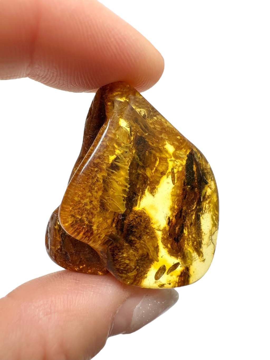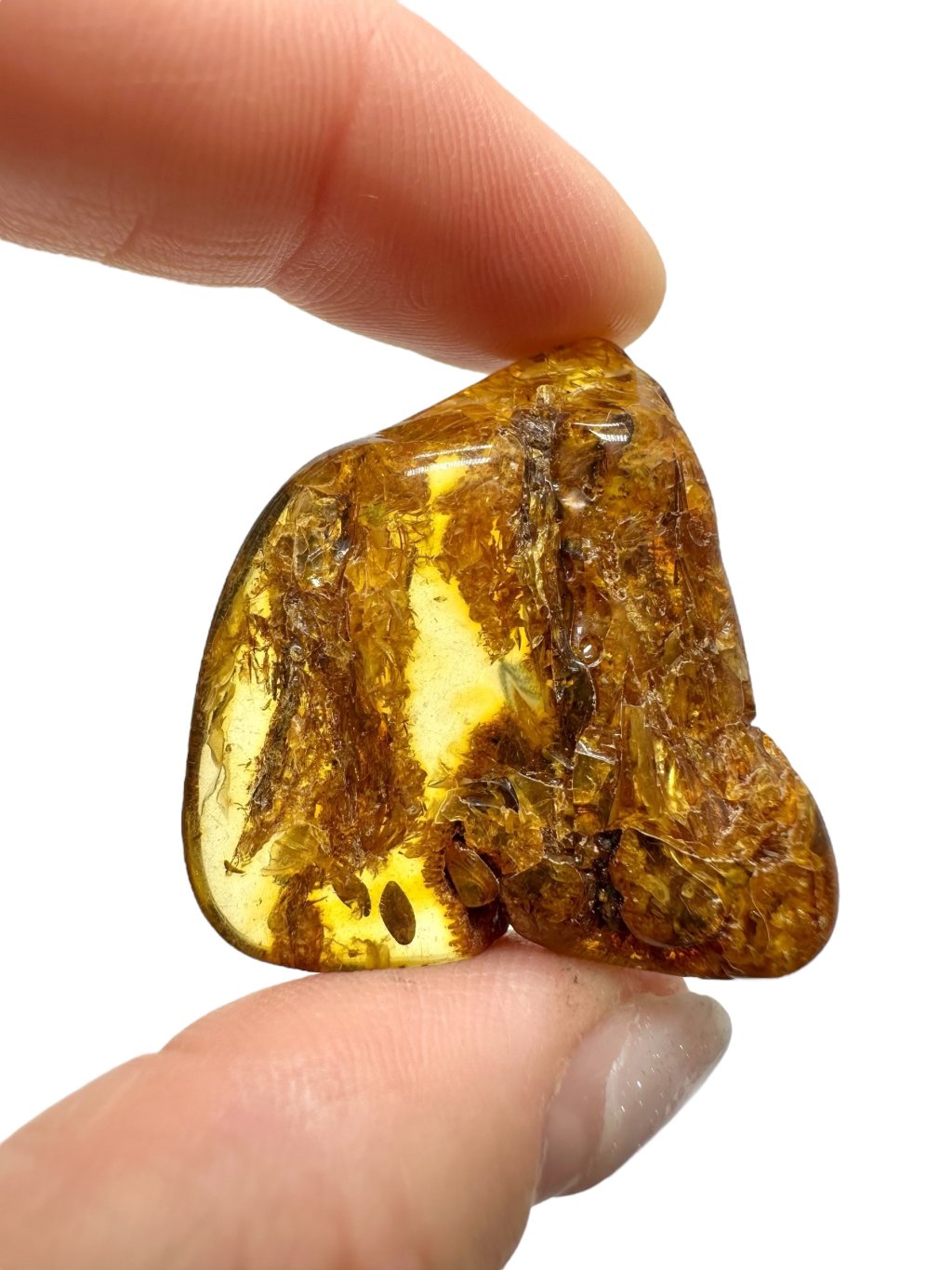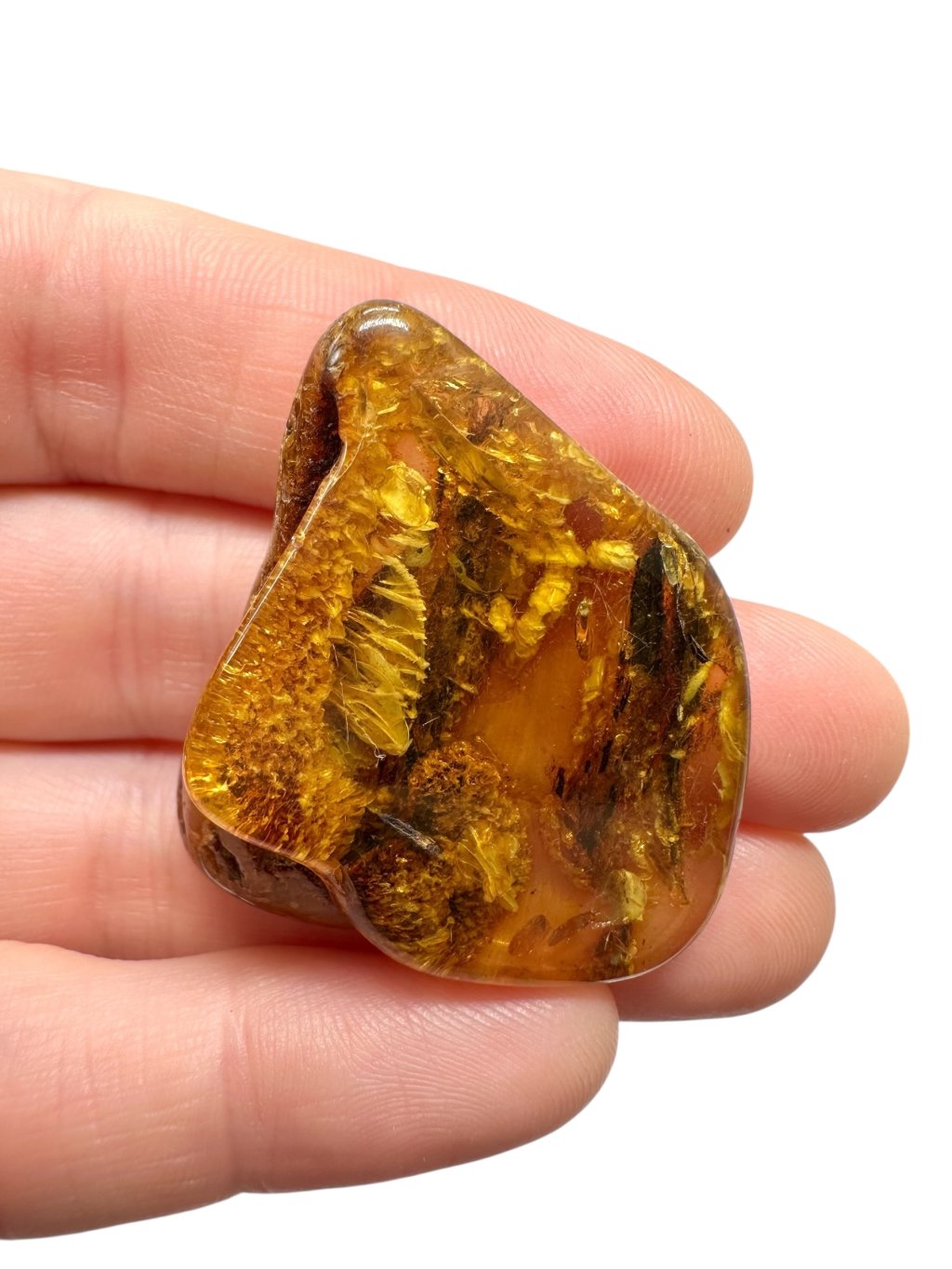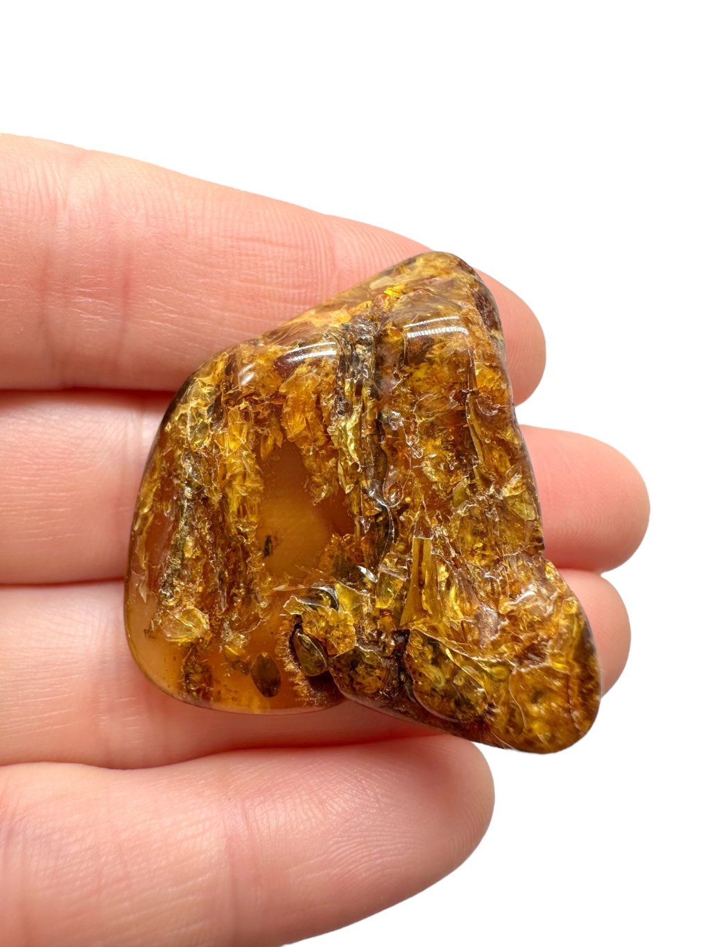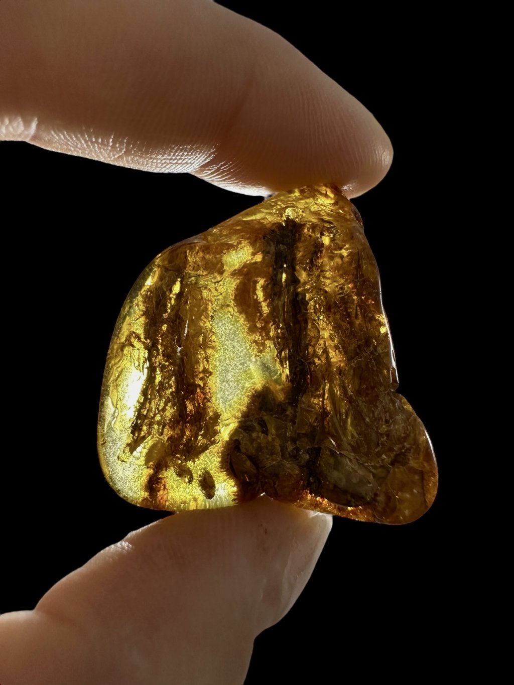Poznámka: Úvodní fotografie byla pořízena s jantarem drženým mezi prsty, takže skrz něj prochází světlo a působí světlejším dojmem, než když je položen na povrchu.