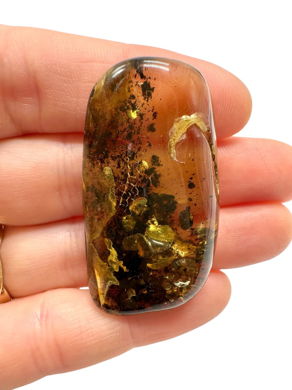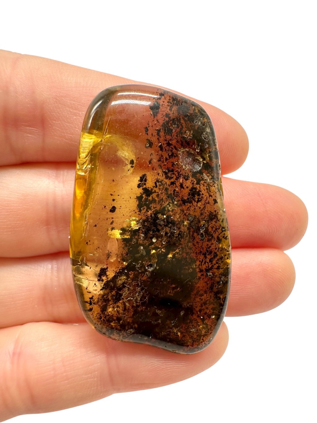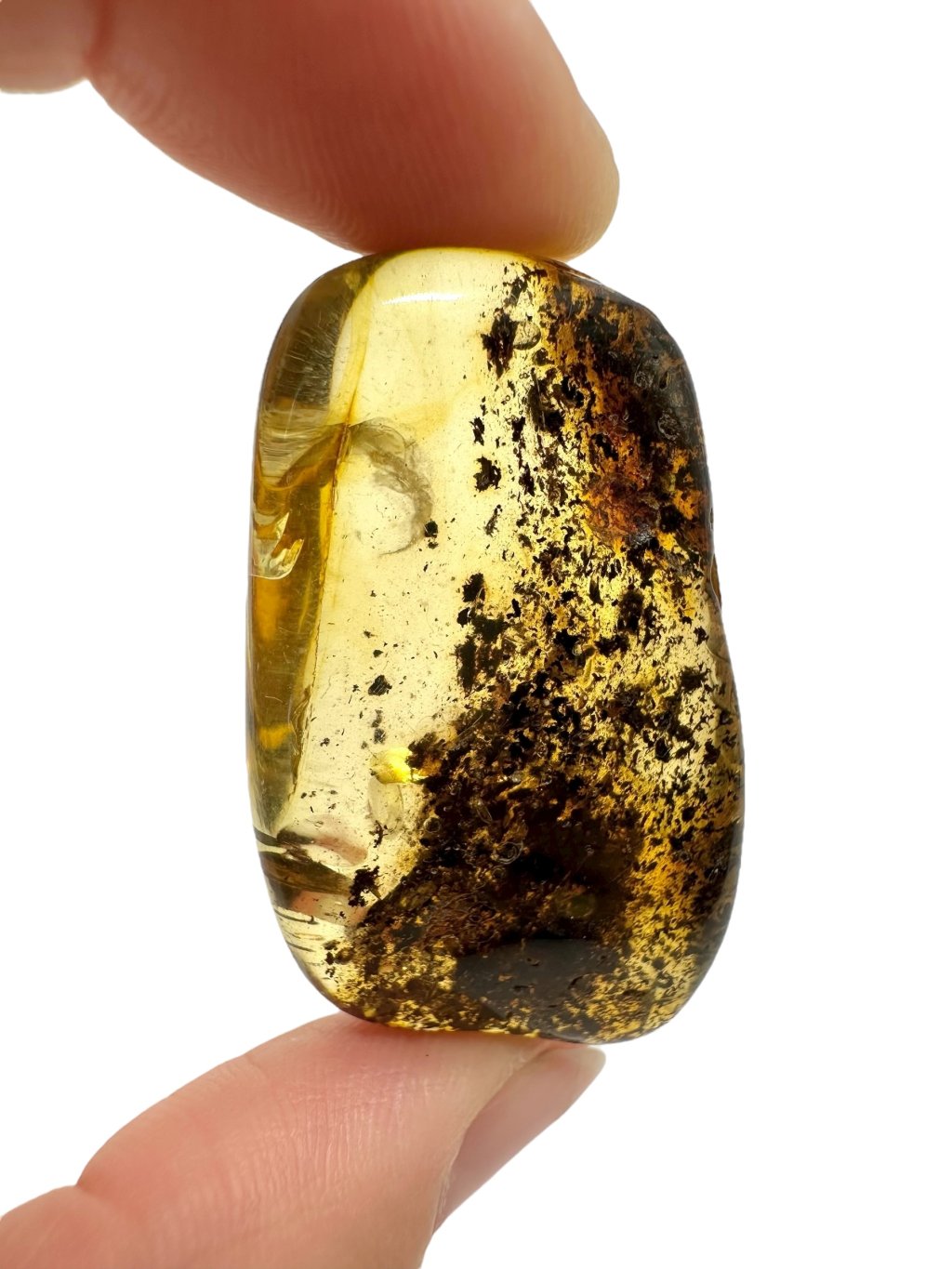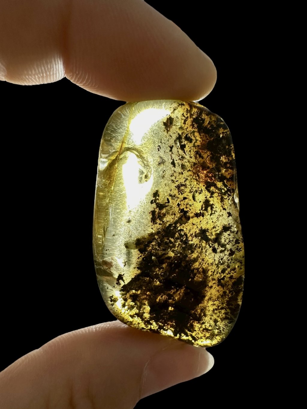 Poznámka: Úvodní fotografie byla pořízena s jantarem drženým mezi prsty, takže skrz něj prochází světlo a působí světlejším dojmem, než když je položen na povrchu.