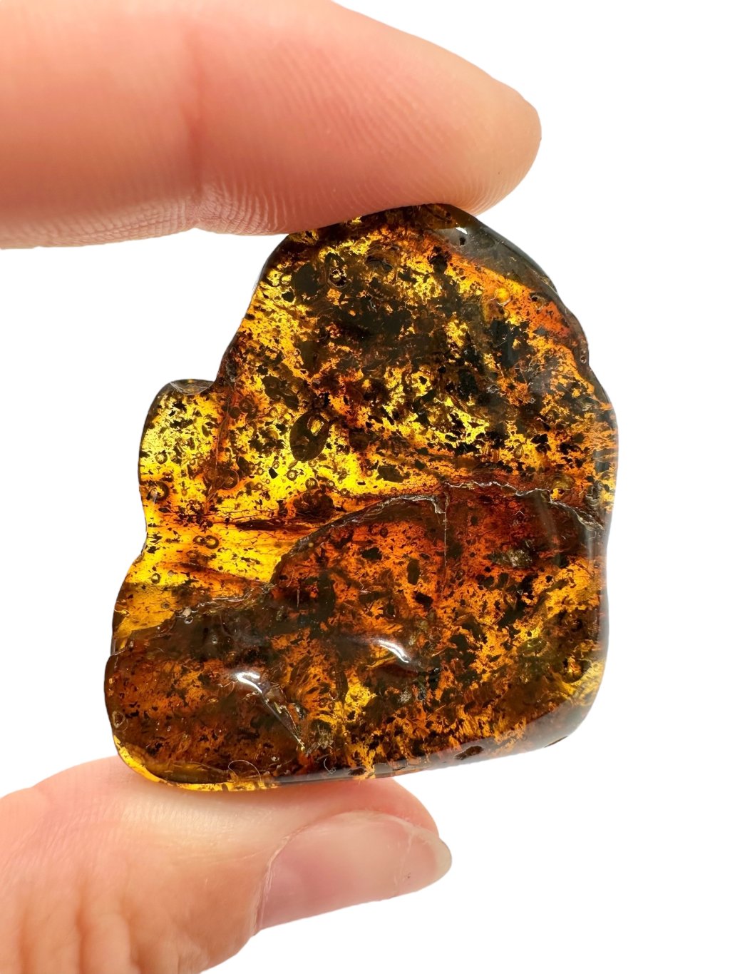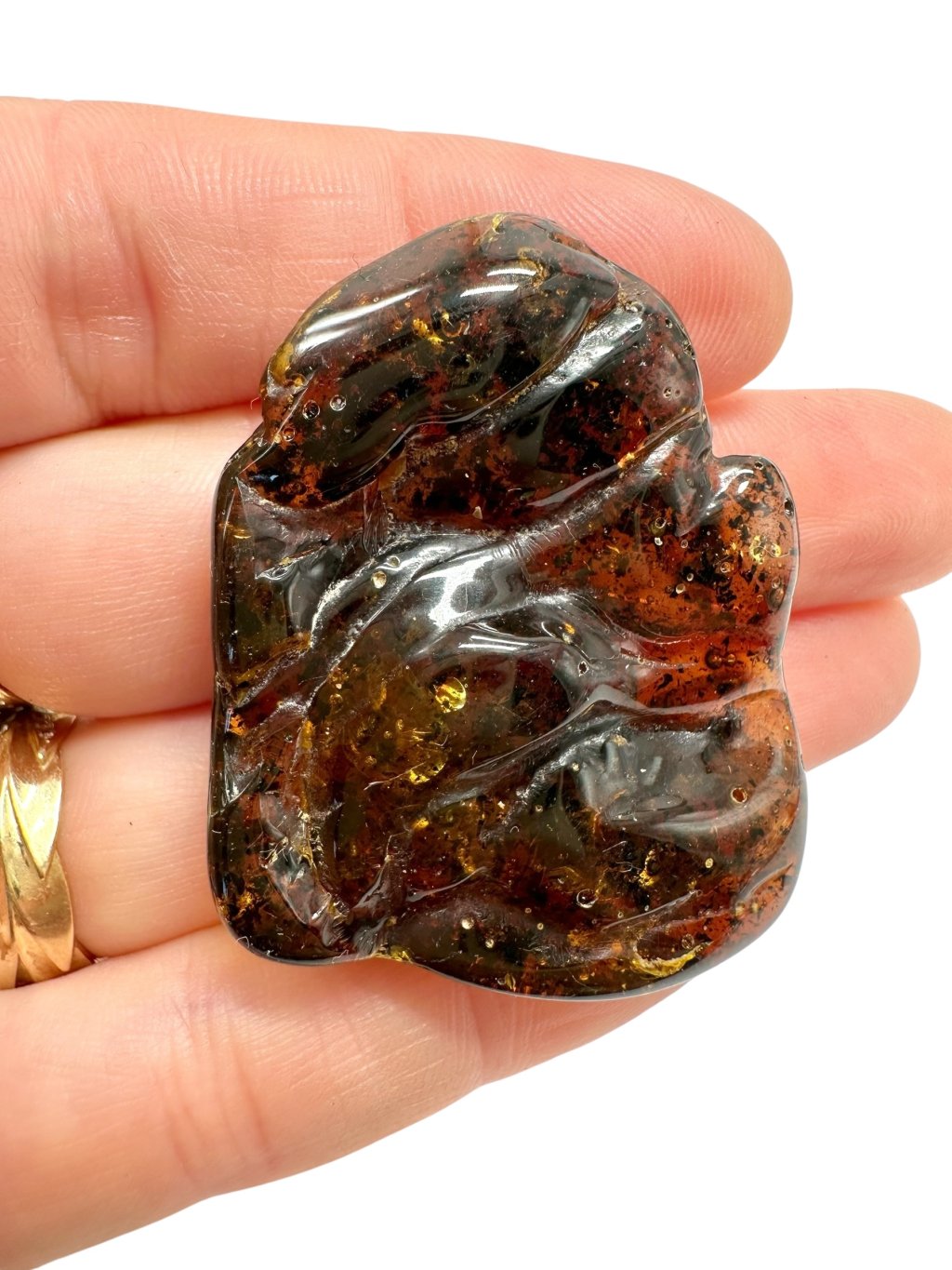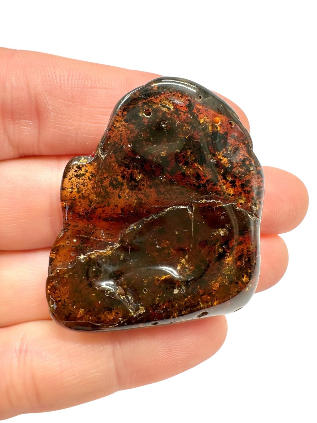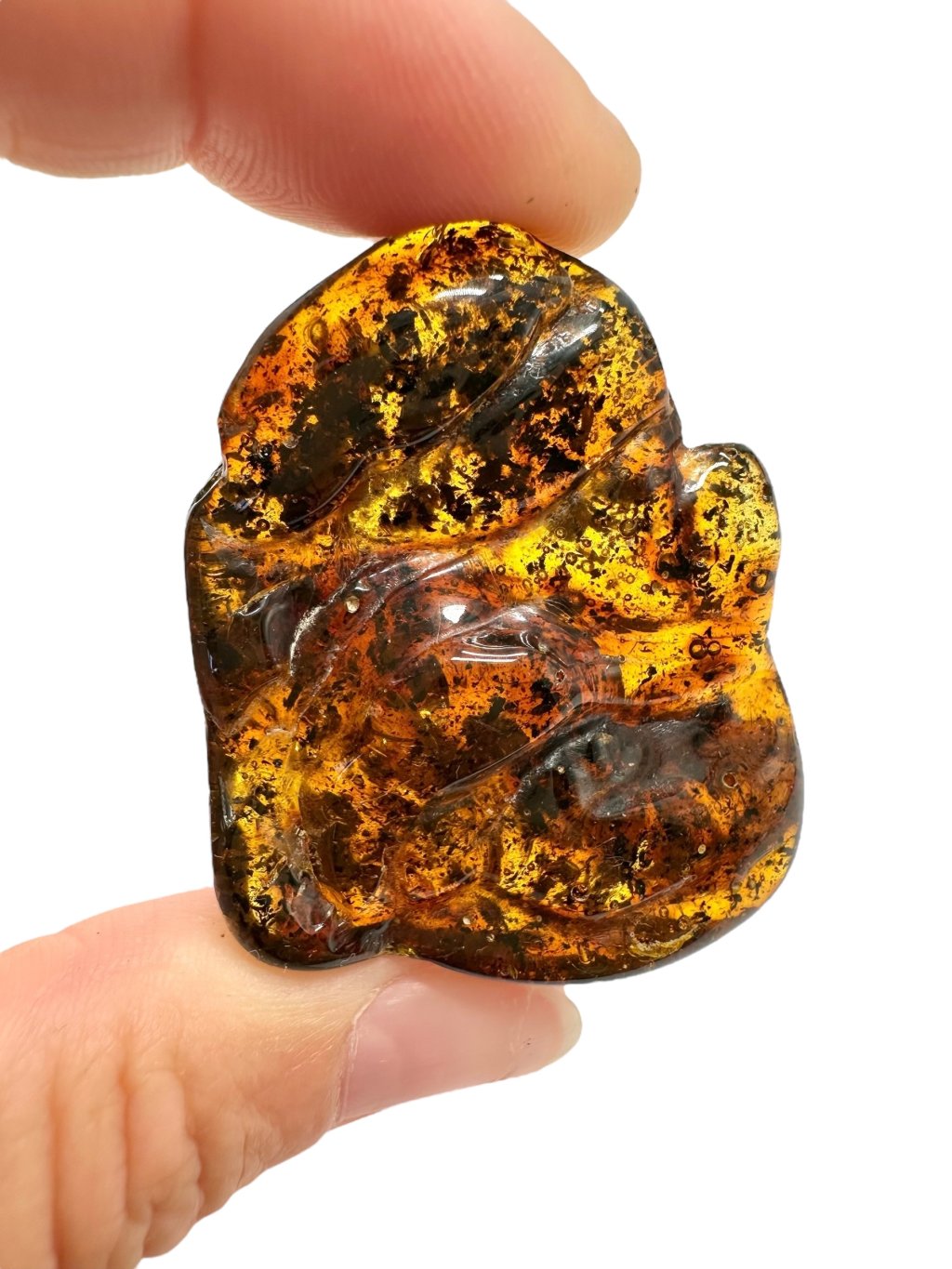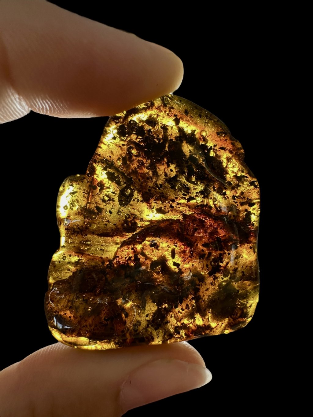 Poznámka: Úvodní fotografie byla pořízena s jantarem drženým mezi prsty, takže skrz něj prochází světlo a působí světlejším dojmem, než když je položen na povrchu.