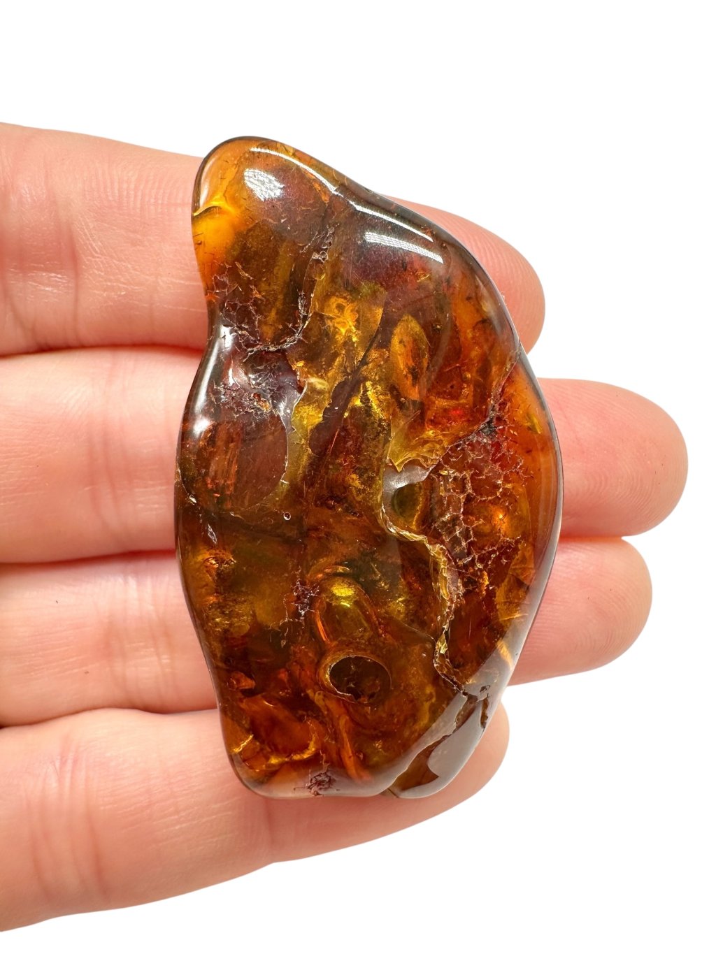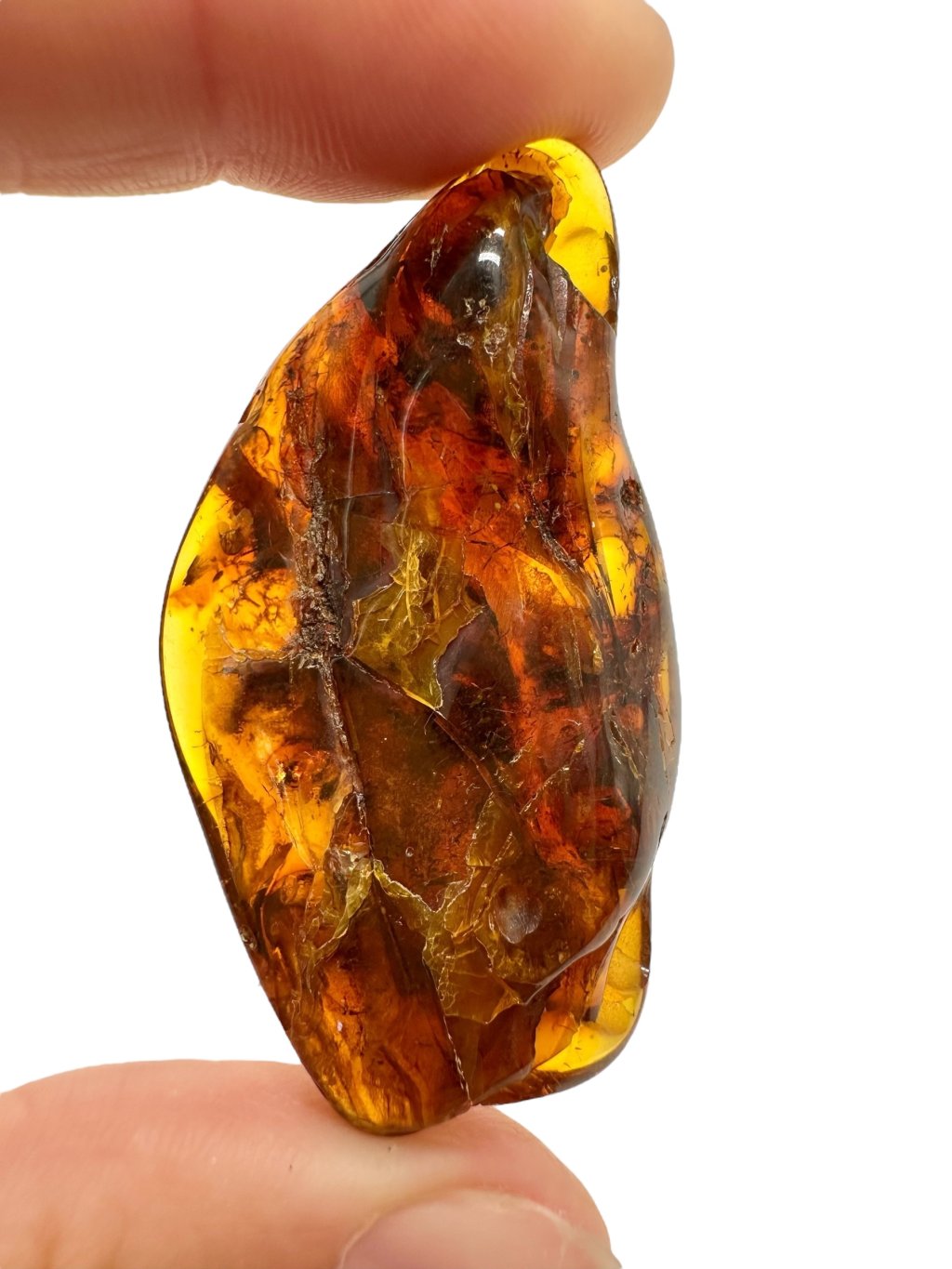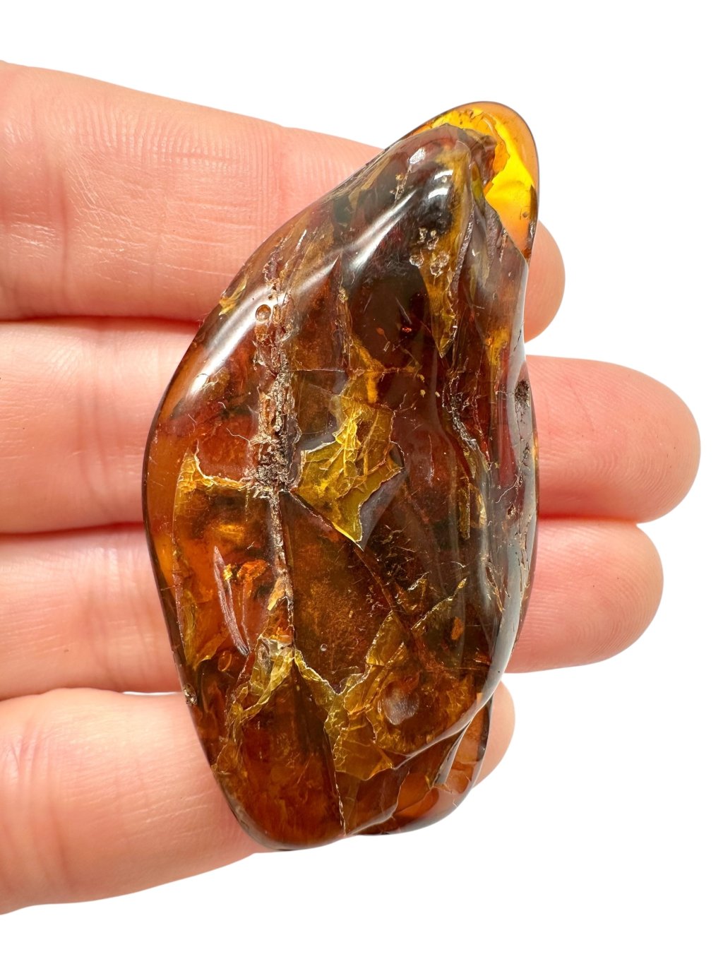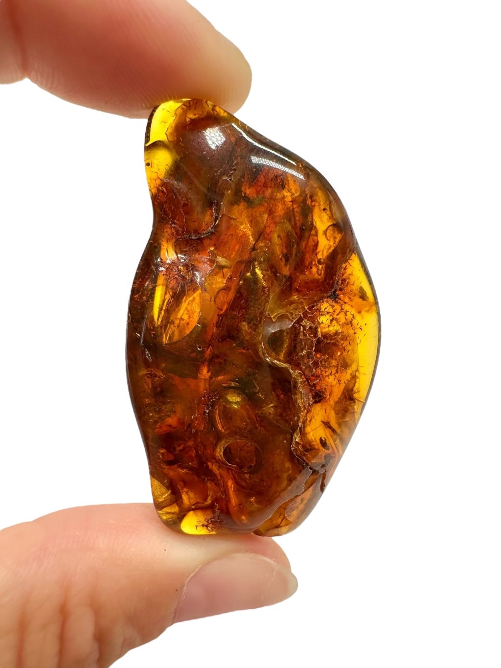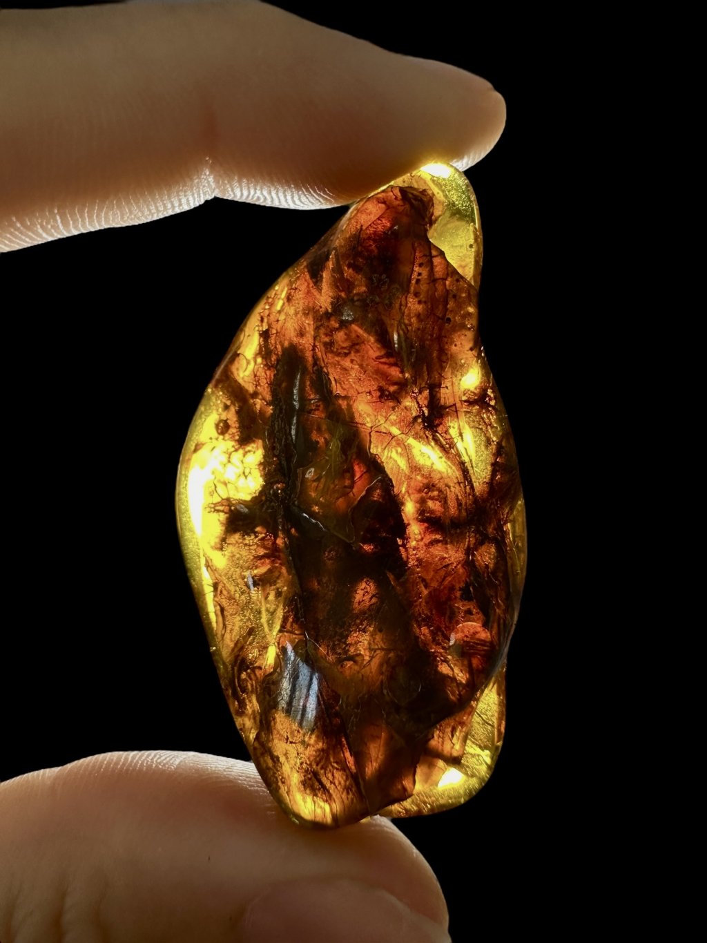 Poznámka: Úvodní fotografie byla pořízena s jantarem drženým mezi prsty, takže skrz něj prochází světlo a působí světlejším dojmem, než když je položen na povrchu.