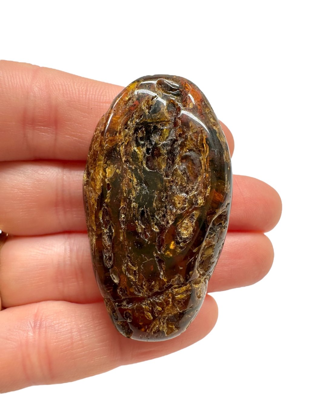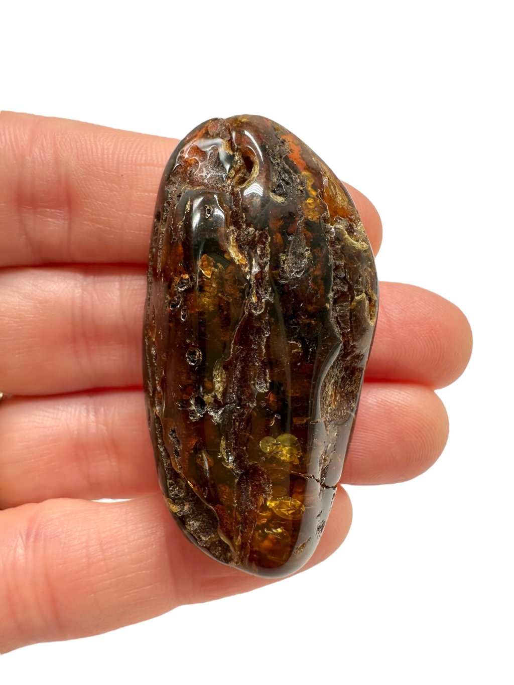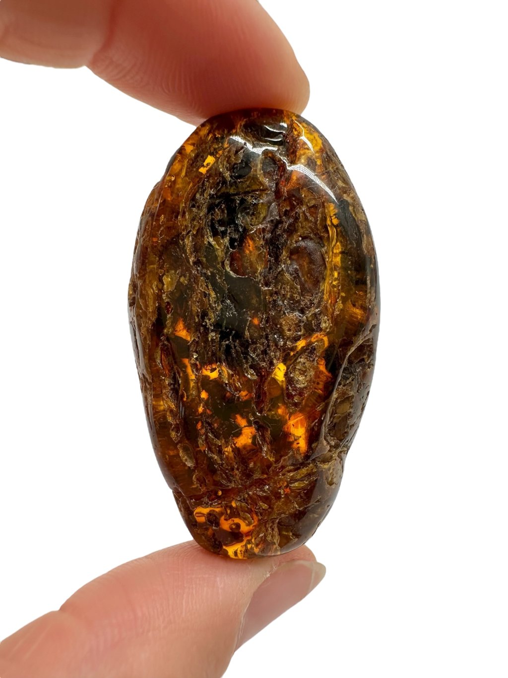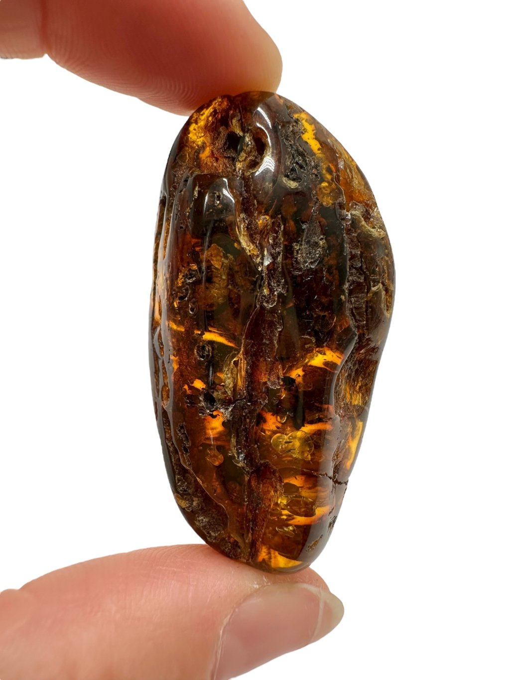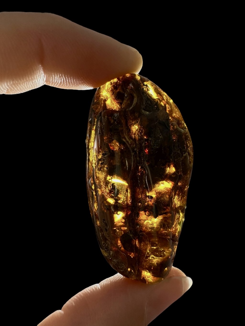 Poznámka: Úvodní fotografie byla pořízena s jantarem drženým mezi prsty, takže skrz něj prochází světlo a působí světlejším dojmem, než když je položen na povrchu.