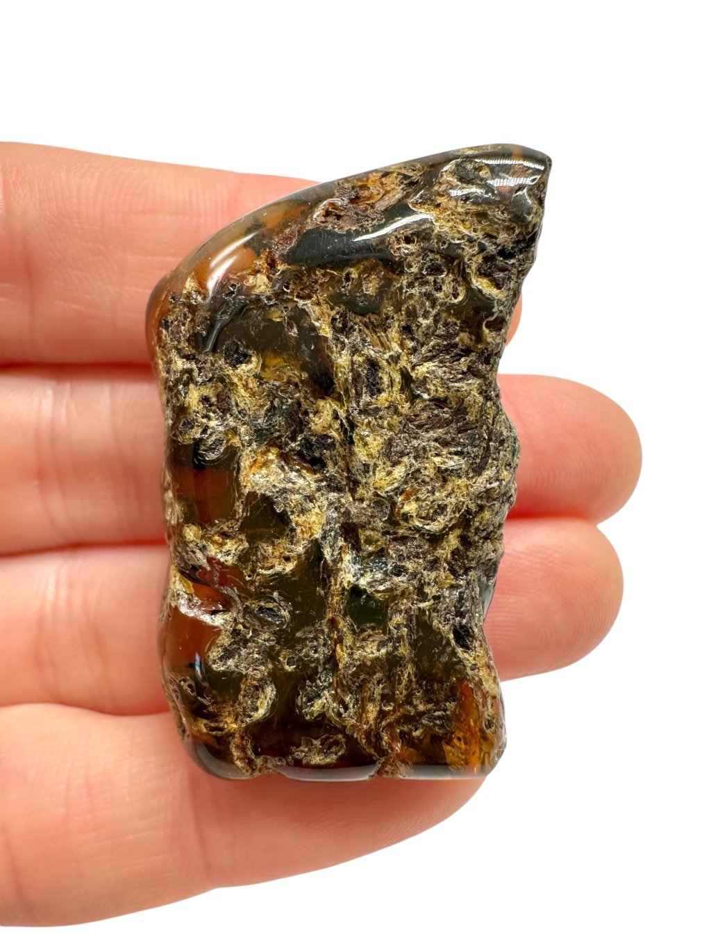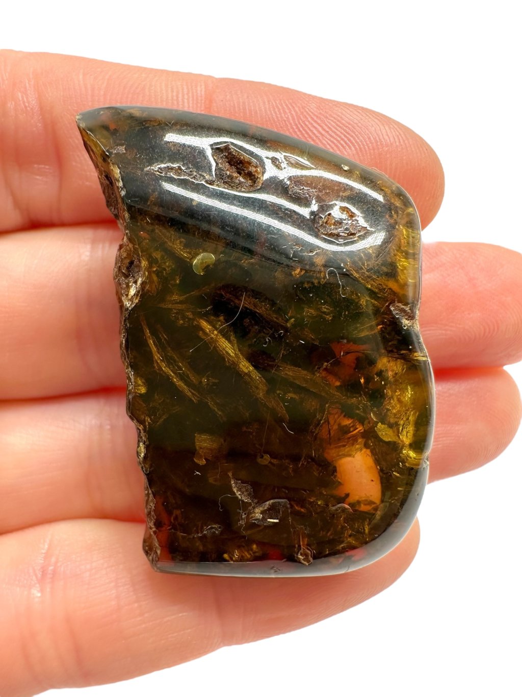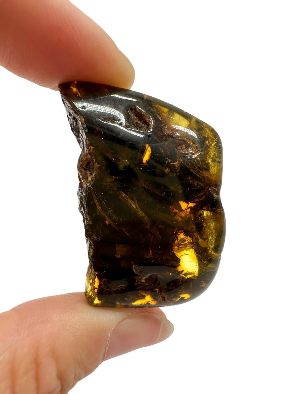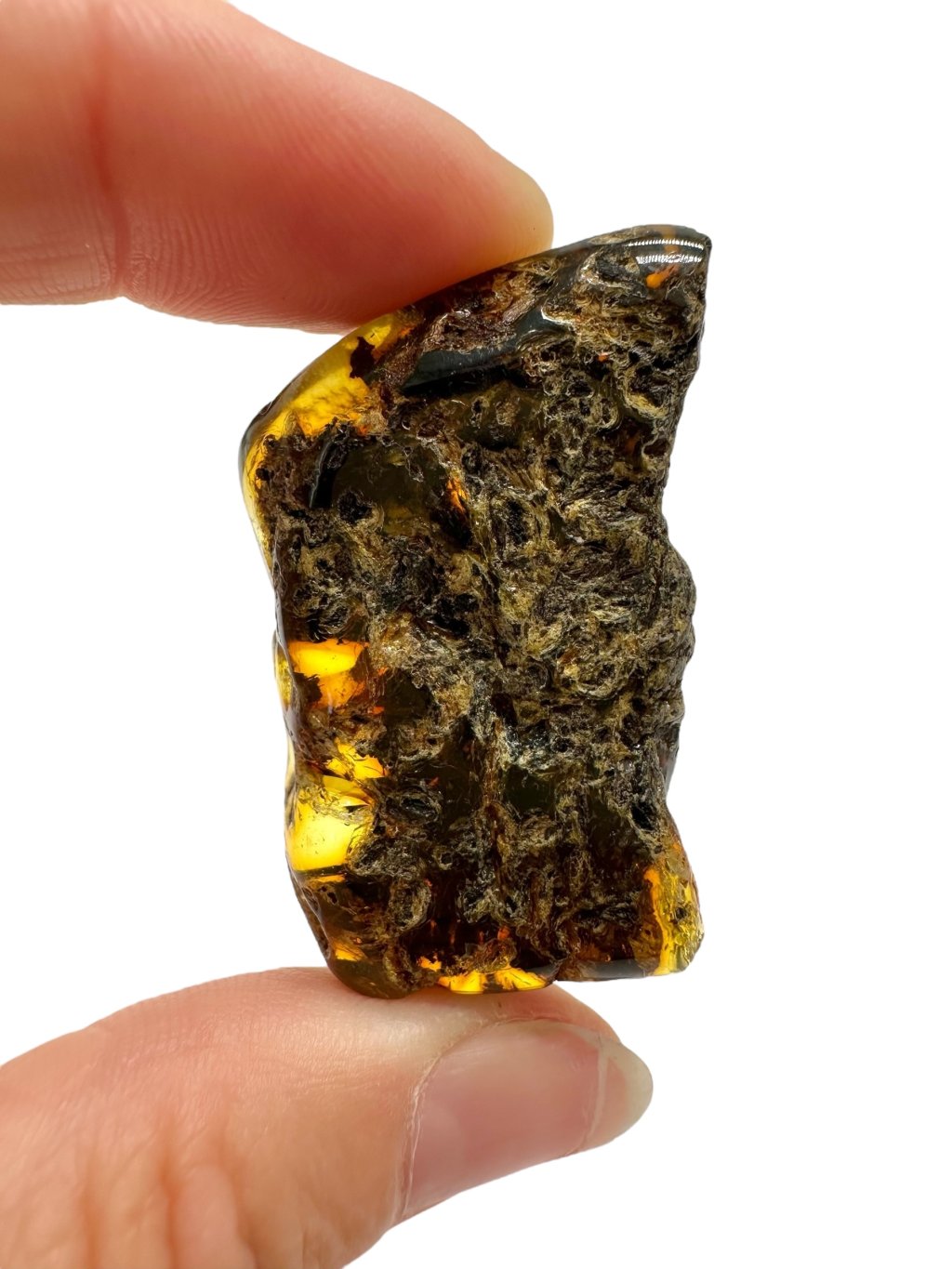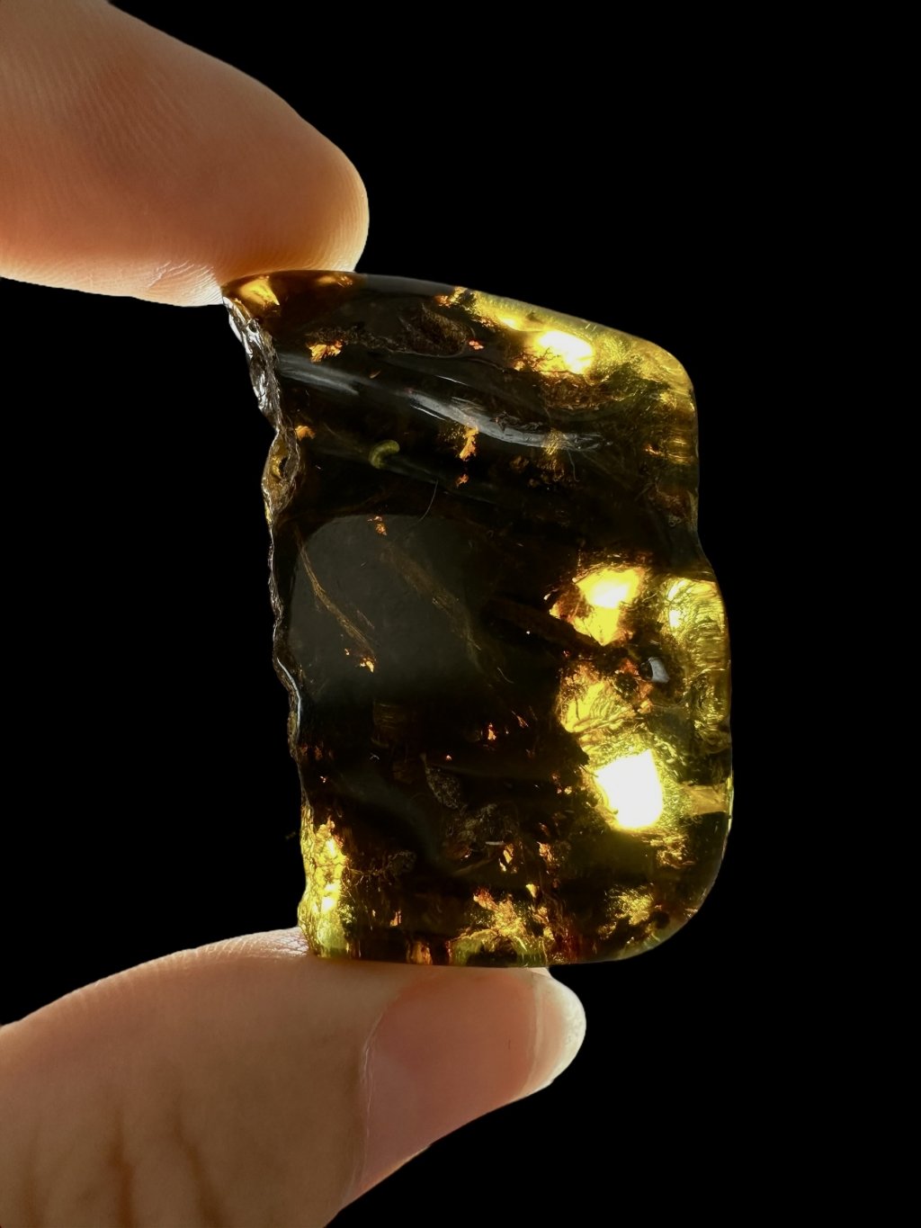 Poznámka: Úvodní fotografie byla pořízena s jantarem drženým mezi prsty, takže skrz něj prochází světlo a působí světlejším dojmem, než když je položen na povrchu.