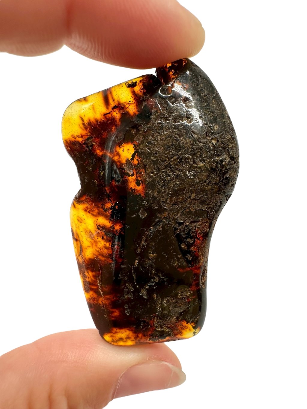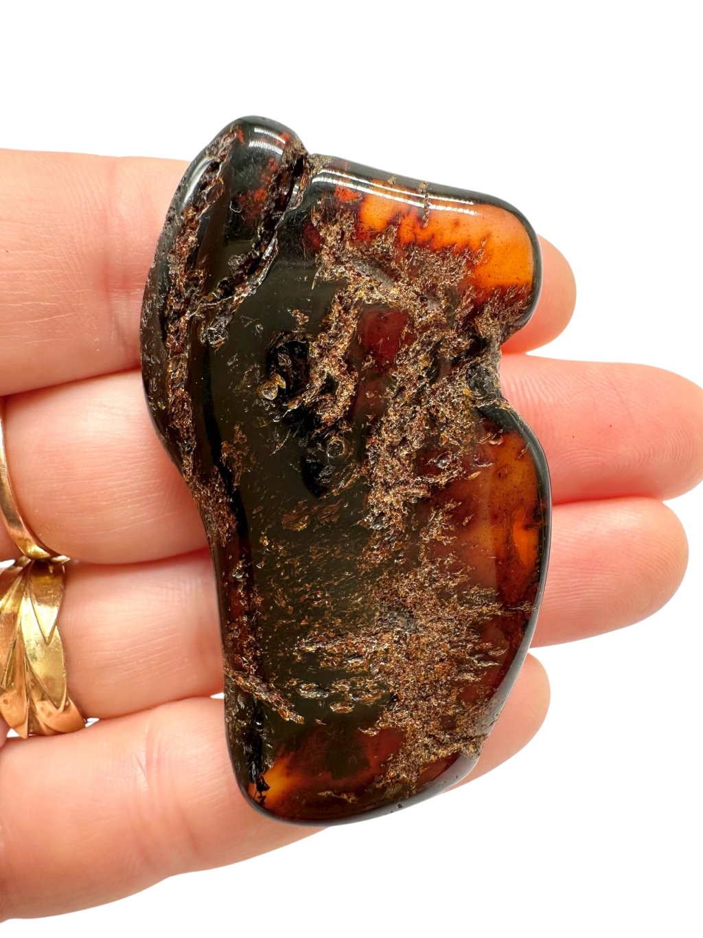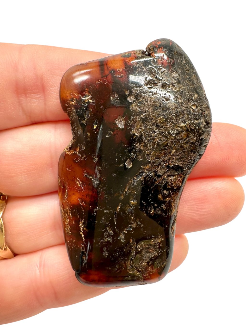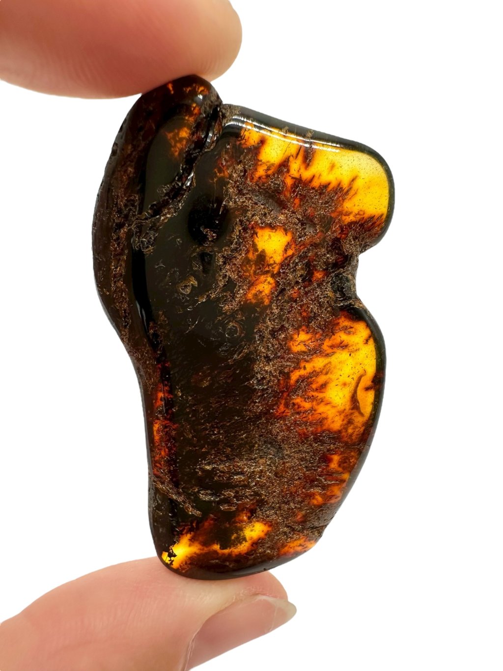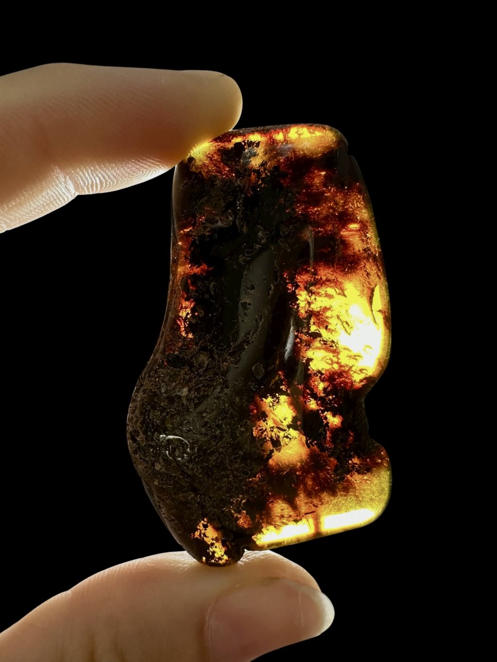 Poznámka: Úvodní fotografie byla pořízena s jantarem drženým mezi prsty, takže skrz něj prochází světlo a působí světlejším dojmem, než když je položen na povrchu.