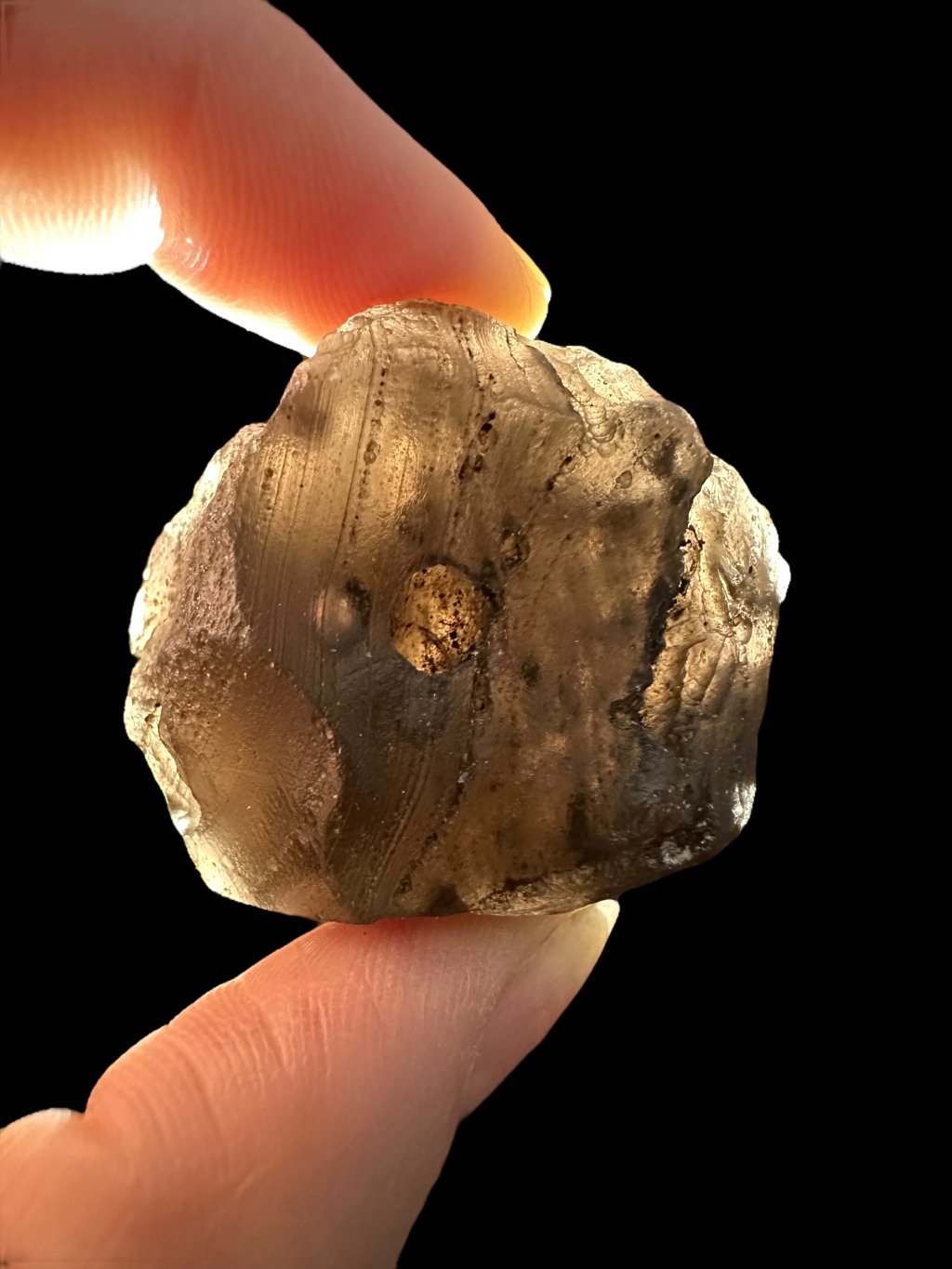 Kolumbianit je sopečné sklo, podobné obsidiánu, které vzniklo rychlým ochlazováním roztavené lávy na povrchu Země. Jeho unikátní chemické složení a struktura mu dodávají charakteristický vzhled a vlastnosti. Kolumbianit je známý svou barvou při průsvitu, která je zbarvena do šedo-hnědých odstínů díky přítomnosti různých minerálů během jeho tvorby. Jeho povrch je jamkovitý, což zapříčinilo působení půdních kyselin, stejně tak jako u vltavínů. Kolumbianit je často vyhledáván pro svou krásu a exotický původ, což ho činí ceněným materiálem pro šperkařství a sběratelství. S kolumbianitem získáte do své sbírky kamenů jedinečný kousek přírody, který zaujme svým vzhledem a původem.