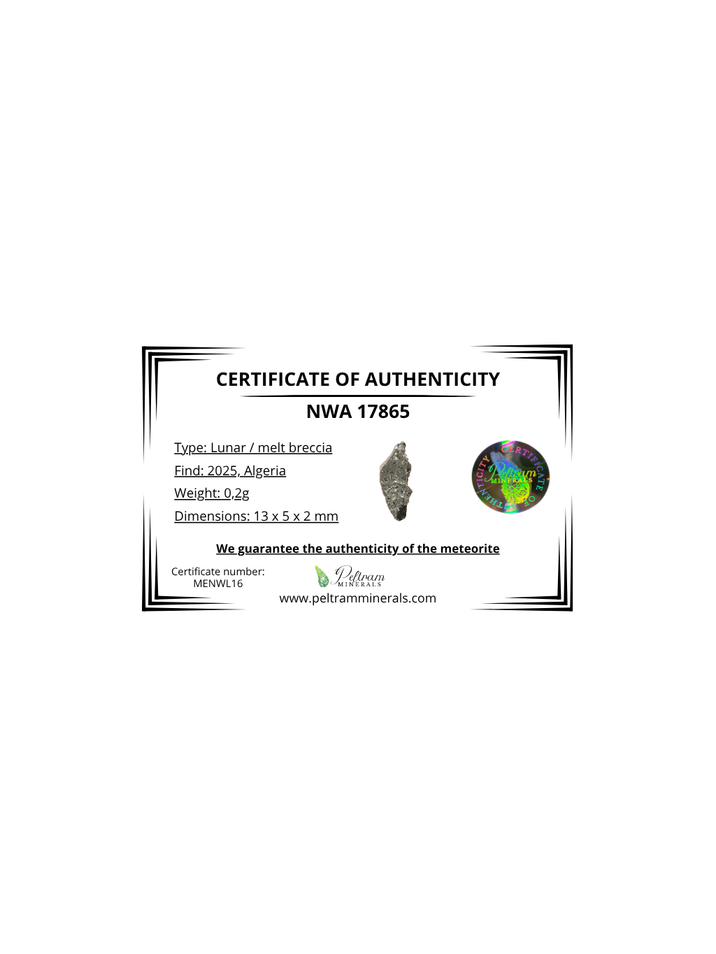 NWA 17865 je výjimečný lunární meteorit pocházející z Alžírské Sahary, který byl nalezen v roce 2025. Ve skutečnosti jde o dva téměř identické kameny o hmotnostech 5951 g a 4249 g, což z něj činí pozoruhodný nález mezi měsíčními meteority. Tento materiál představuje skutečný fragment měsíční kůry, vyvržený z povrchu Měsíce po dávné impaktní události.