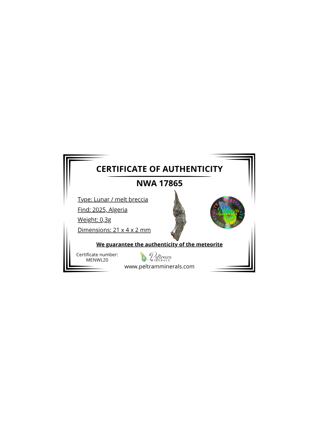 NWA 17865 je výjimečný lunární meteorit pocházející z Alžírské Sahary, který byl nalezen v roce 2025. Ve skutečnosti jde o dva téměř identické kameny o hmotnostech 5951 g a 4249 g, což z něj činí pozoruhodný nález mezi měsíčními meteority. Tento materiál představuje skutečný fragment měsíční kůry, vyvržený z povrchu Měsíce po dávné impaktní události.