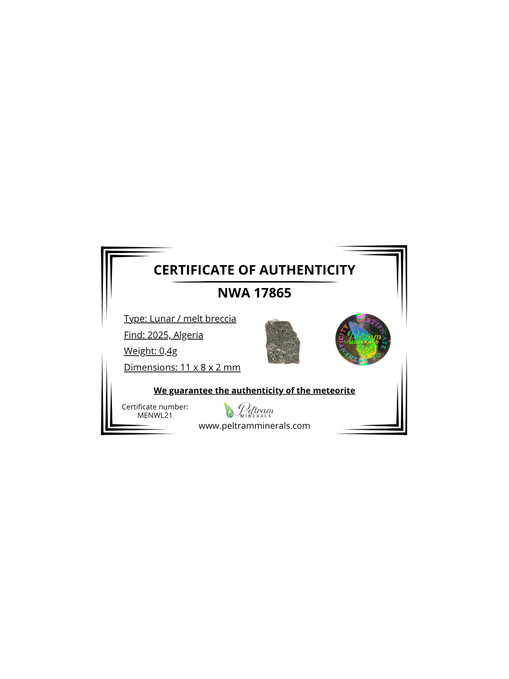 NWA 17865 je výjimečný lunární meteorit pocházející z Alžírské Sahary, který byl nalezen v roce 2025. Ve skutečnosti jde o dva téměř identické kameny o hmotnostech 5951 g a 4249 g, což z něj činí pozoruhodný nález mezi měsíčními meteority. Tento materiál představuje skutečný fragment měsíční kůry, vyvržený z povrchu Měsíce po dávné impaktní události.