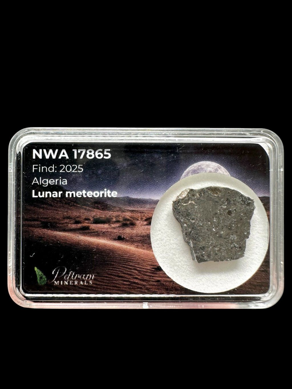 NWA 17865 je výjimečný lunární meteorit pocházející z Alžírské Sahary, který byl nalezen v roce 2025. Ve skutečnosti jde o dva téměř identické kameny o hmotnostech 5951 g a 4249 g, což z něj činí pozoruhodný nález mezi měsíčními meteority. Tento materiál představuje skutečný fragment měsíční kůry, vyvržený z povrchu Měsíce po dávné impaktní události.