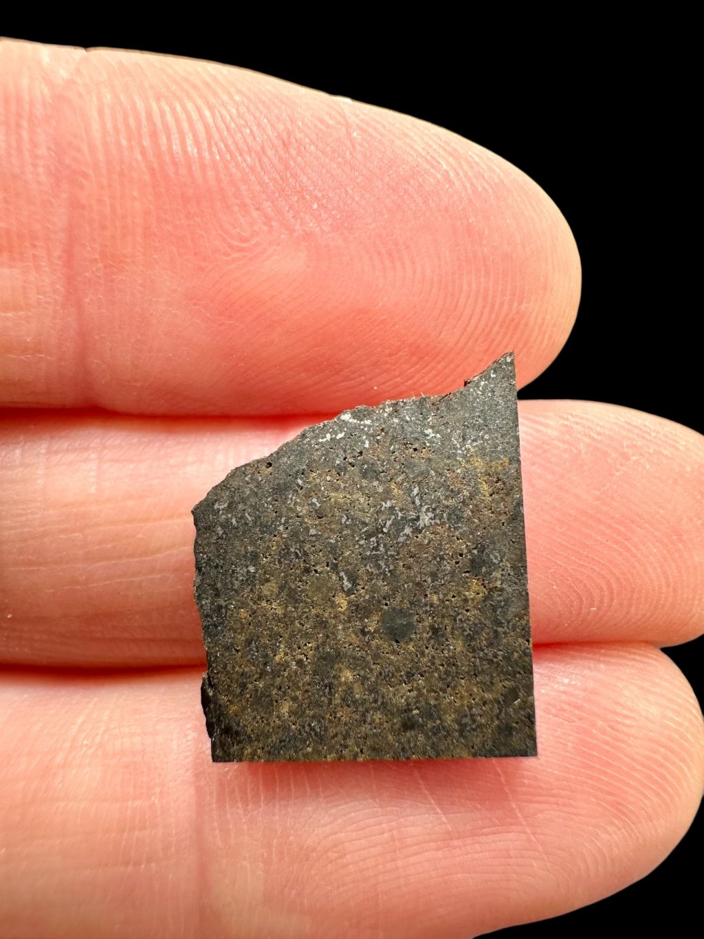 V některých vzorcích lze také pozorovat drobné praskliny, které jsou částečně vyplněny bělavou usazeninou známou jako caliche – jedná se o karbonátový materiál vznikající v aridních (suchých) oblastech, kde meteorit po dopadu dlouho ležel.