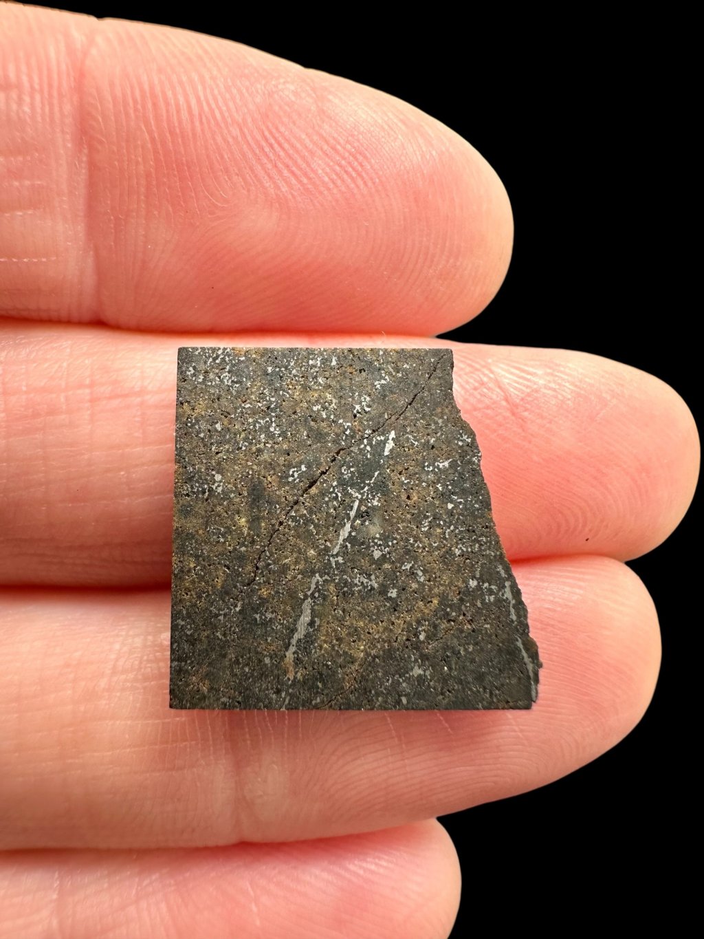 V některých vzorcích lze také pozorovat drobné praskliny, které jsou částečně vyplněny bělavou usazeninou známou jako caliche – jedná se o karbonátový materiál vznikající v aridních (suchých) oblastech, kde meteorit po dopadu dlouho ležel.