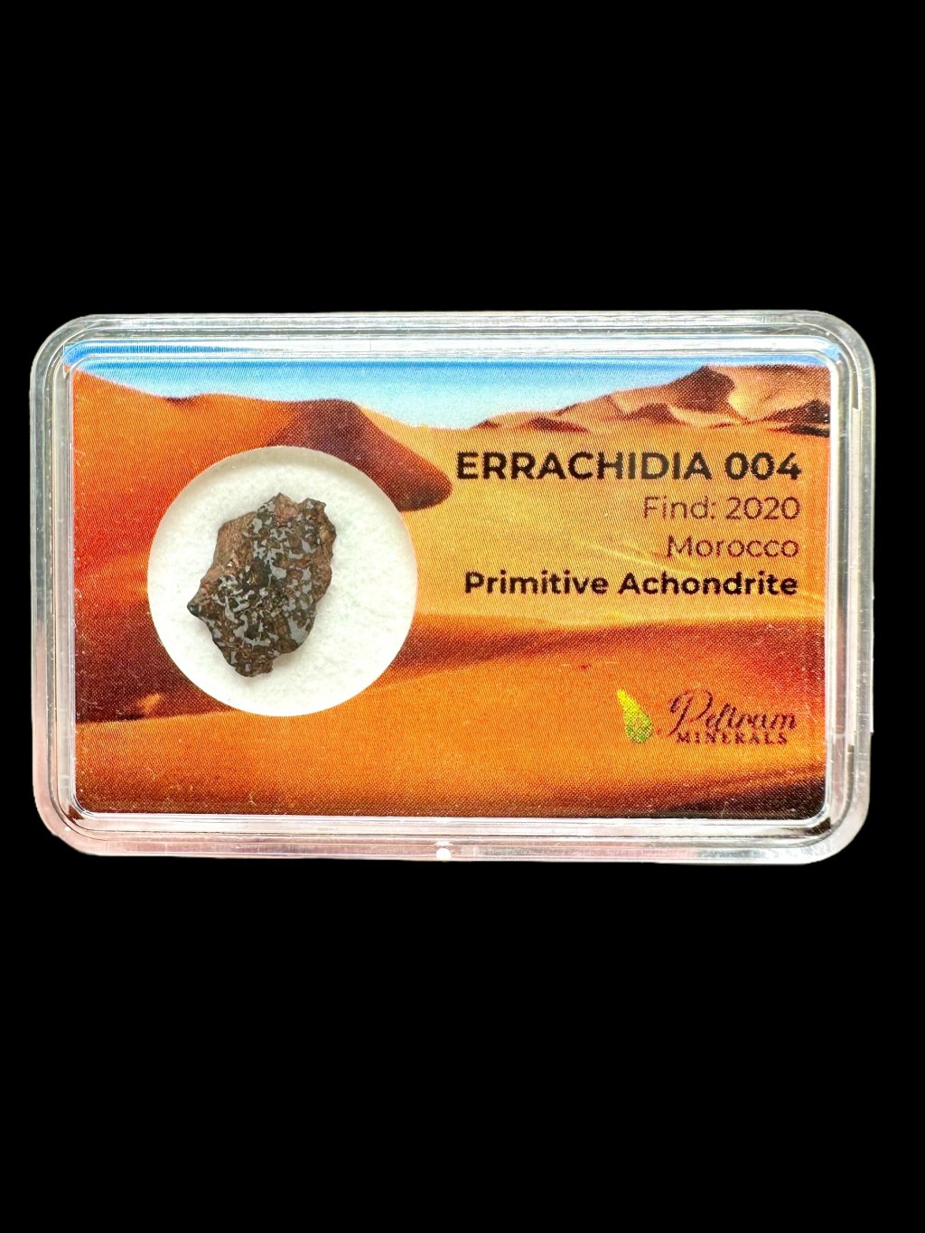 Meteorit Errachidia 004 byl objeven v roce 2020 v Maroku, v regionu Errachidida. Tento meteorit je klasifikován jako primitivní achondrit ze skupiny winonaitů, což naznačuje jeho starobylý původ. Celkové nalezené množství tohoto meteoritu je přibližně 2,64 kg. Winonaity jsou známy svou složitou historií formování, která sahá až do raných fází sluneční soustavy.