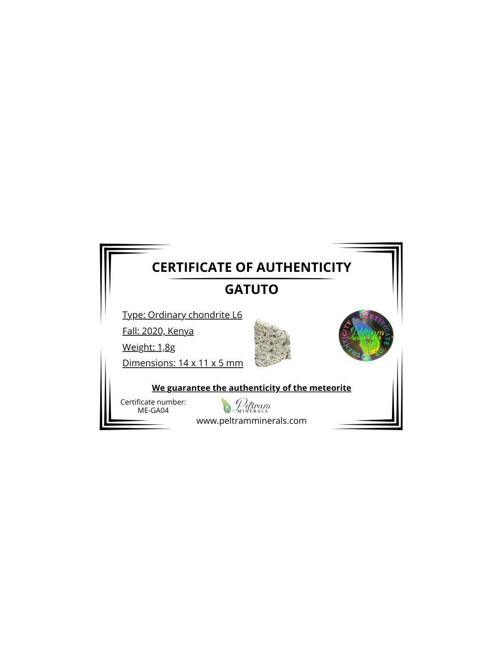 Meteorit Gatuto je obyčejný chondrit třídy L6, což naznačuje, že obsahuje nižší množství železa ve srovnání s jinými chondrity. Dopadl 24. dubna 2020 v oblasti Kirinyaga v Keni. Událost byla pozorována kolem 20:27 místního času, kdy svědci zaznamenali jasnou stopu na obloze, následovanou třemi detonacemi a dalším delším zvukem končícím výbuchem. Celková hmotnost nalezených fragmentů je odhadována na přibližně 25 kilogramů.