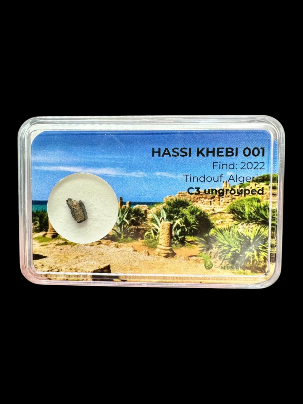 Meteorit Hassi Khebi 001 byl objeven v roce 2022 v oblasti Tindouf v Alžírsku. Jedná se o uhlíkatý chondrit (C3-ung), což označuje, že jde o neklasifikovaný typ uhlíkatého chondritu. Číslo 3 v označení značí, že meteorit je méně metamorfovaný než ty s označením 4 nebo 5, což znamená, že chondry v něm jsou velmi dobře zachovány. Hmotnost meteoritu činí přibližně 500 gramů.