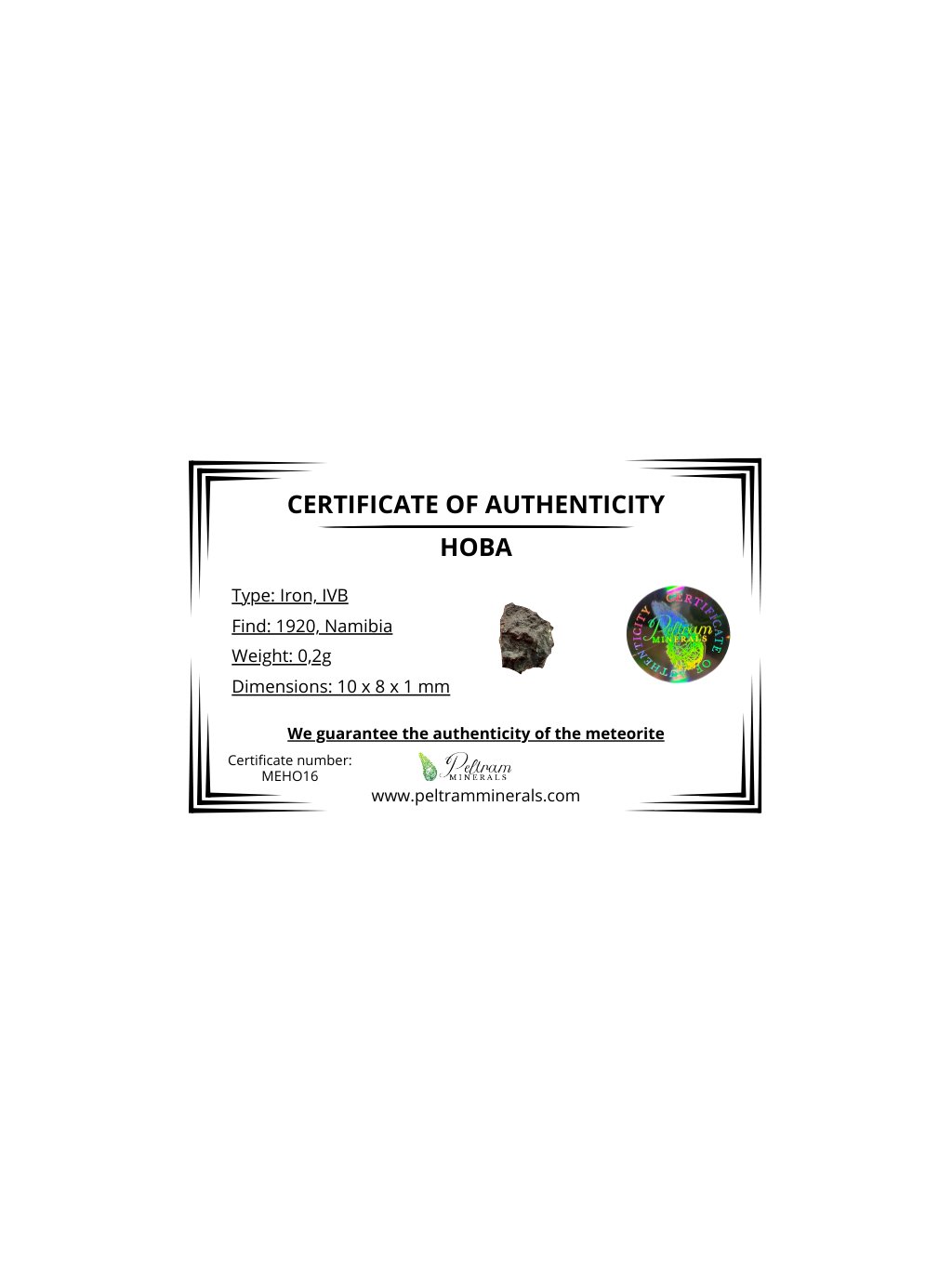 Meteorit Hoba je největším známým železným meteoritem na světě a zároveň největším přirozeně ležícím kusem železa na Zemi. Byl objeven náhodou při orbě pole v roce 1920 na farmě Hoba West poblíž Grootfonteinu v Namibii, kde stále leží na původním místě dopadu. Přesné datum dopadu meteoritu Hoba není známo, ale odhaduje se, že na Zemi dopadl přibližně před 80 000 lety. Jeho hmotnost se odhaduje na přibližně 60 tun, což z něj činí unikát mezi meteority.