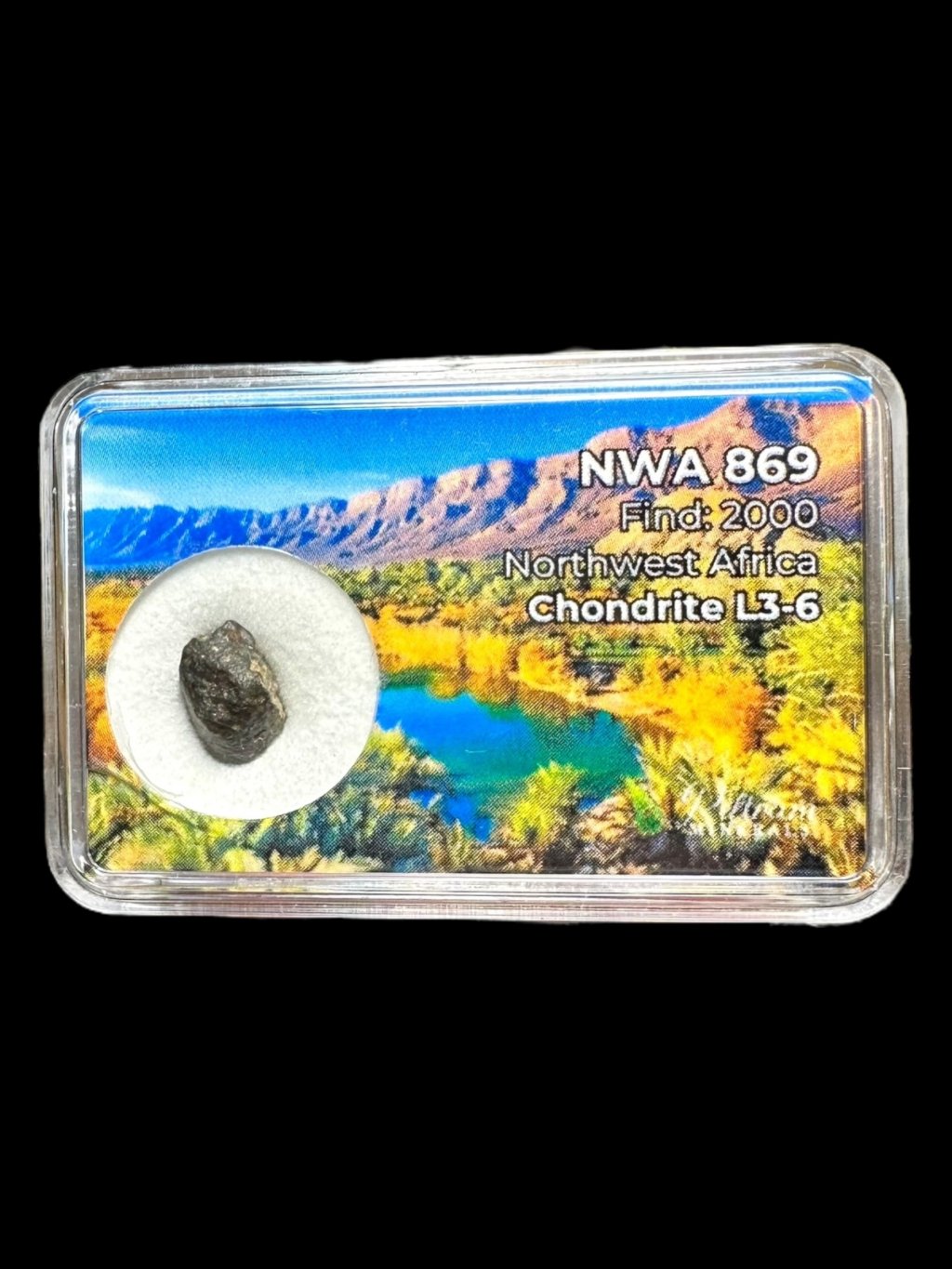 Meteorit NWA 869 je obyčejný chondrit L3-6, objevený v roce 2000 na neznámé lokalitě v Saharské poušti. Celková hmotnost nalezených fragmentů dosahuje přibližně 2 tun, a exempláře mohou mít hmotnost od několika gramů po více než 20 kilogramů. Tento meteorit je unikátní tím, že obsahuje brekcii, což znamená, že je složen z fragmentů různých typů chondritů a zahrnuje chondruly, kovové částečky a další inkluze. V důsledku působení větrné eroze byla u mnoha vzorků fúzní kůra buď odstraněna, nebo vyhlazena, což způsobilo i vznik hlubokých erozních stop na povrchu.