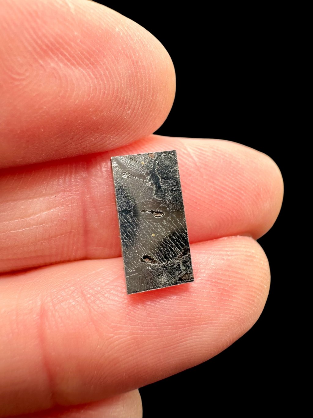 Povrchová úprava: řezaný, leštěný plátek (leptáno kyselinou pouze z jedné strany – viditelné Widmanstättenovy obrazce, druhá strana je pouze leštěná bez leptání)