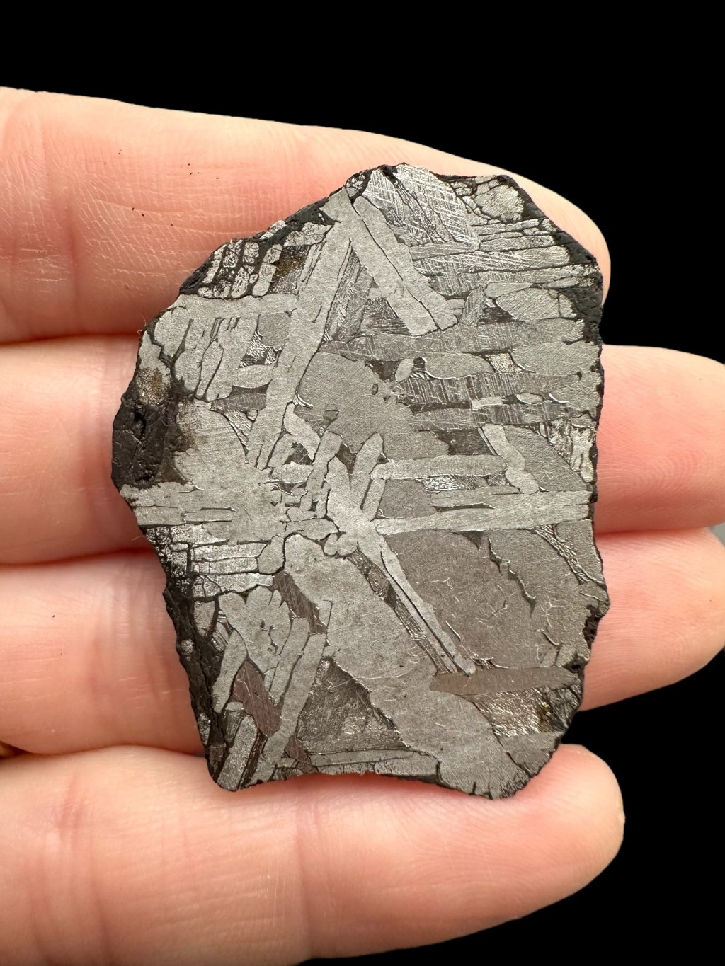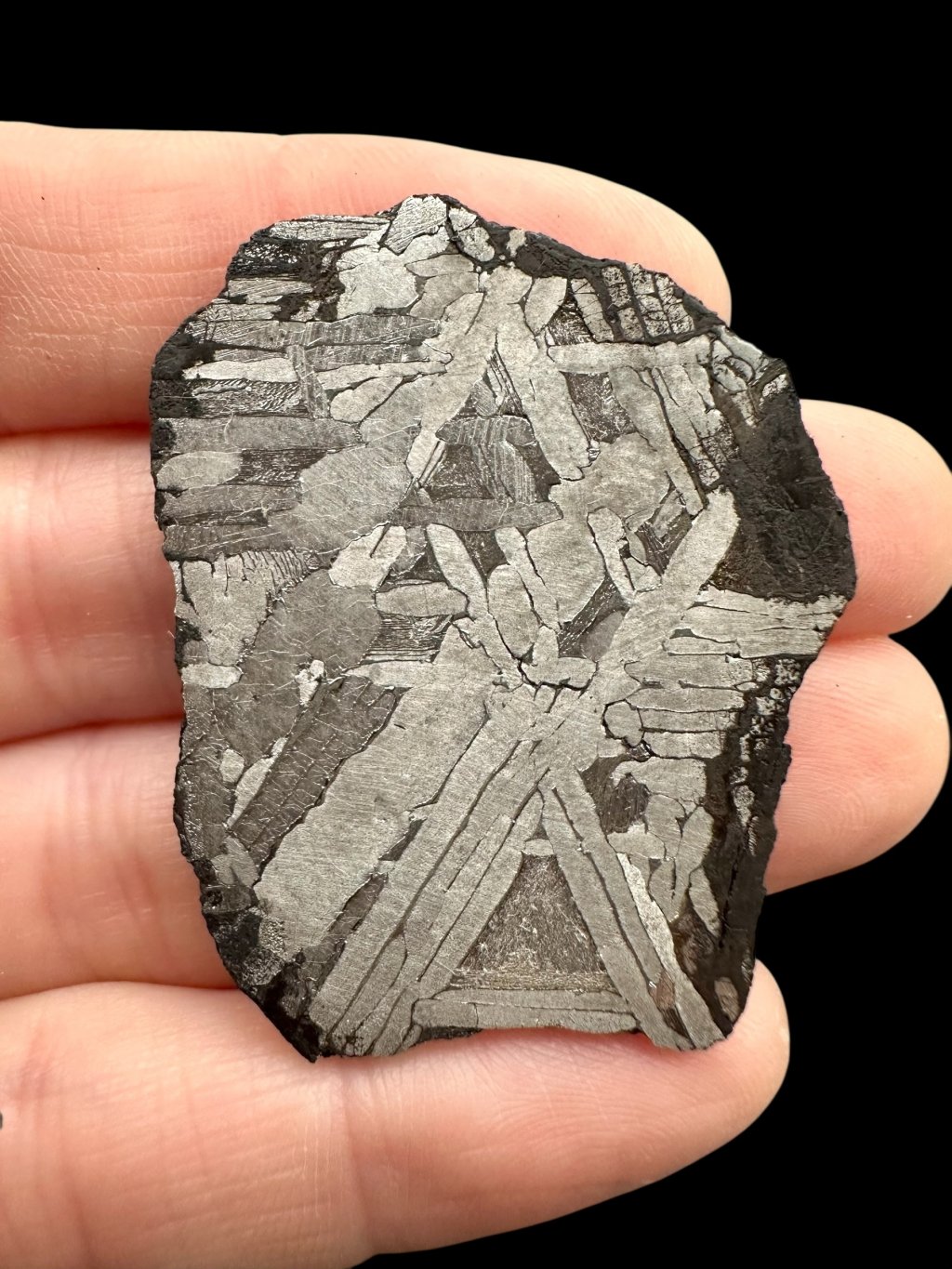 Tip: Widmanstättenovy obrazce jsou u tohoto exempláře mimořádně výrazné, což nebývá běžné – jedná se o špičkovou kvalitu.