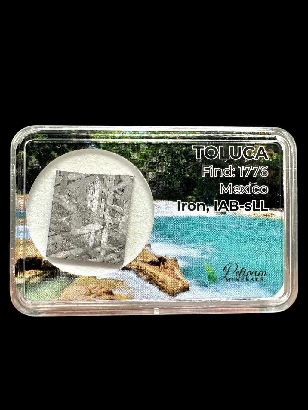 Toluca je železný meteorit, který patří do skupiny tzv. oktaedritů, konkrétně do chemické skupiny IAB, a spadá do podskupiny sLL (subgroup Low-Au, Low-Ni), což znamená, že obsahuje nižší množství zlata a niklu ve srovnání s jinými meteority IAB. Přesto si uchovává dostatečně vysoký obsah železa a dalších kovů, aby mu dodával výraznou kovově stříbrnou barvu. Při naleptání a vyleštění se tak mohou odhalit tzv. Widmanstättenovy obrazce, tedy typické krystalické struktury, které vznikají při velmi pomalém chladnutí kovu ve vesmíru. Díky vysokému obsahu železa je velmi těžký, takže i relativně malý úlomek může mít překvapivě velkou hmotnost. Vedle železa a niklu obsahuje i menší množství dalších minerálů, jako je grafit nebo troilit, které někdy vytvářejí drobné inkluze v materiálu.
