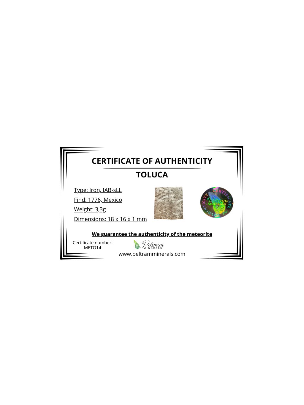Toluca je železný meteorit, který patří do skupiny tzv. oktaedritů, konkrétně do chemické skupiny IAB, a spadá do podskupiny sLL (subgroup Low-Au, Low-Ni), což znamená, že obsahuje nižší množství zlata a niklu ve srovnání s jinými meteority IAB. Přesto si uchovává dostatečně vysoký obsah železa a dalších kovů, aby mu dodával výraznou kovově stříbrnou barvu. Při naleptání a vyleštění se tak mohou odhalit tzv. Widmanstättenovy obrazce, tedy typické krystalické struktury, které vznikají při velmi pomalém chladnutí kovu ve vesmíru. Díky vysokému obsahu železa je velmi těžký, takže i relativně malý úlomek může mít překvapivě velkou hmotnost. Vedle železa a niklu obsahuje i menší množství dalších minerálů, jako je grafit nebo troilit, které někdy vytvářejí drobné inkluze v materiálu.