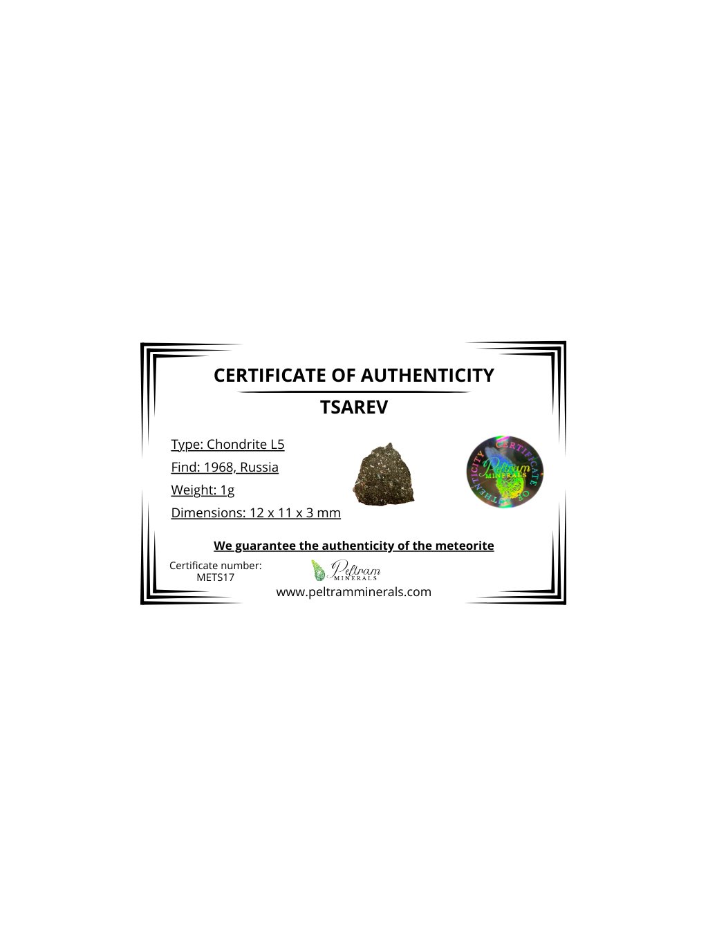 Typ meteoritu: Meteorit Tsarev je klasifikován jako běžný chondrit typu L5, což znamená, že obsahuje nižší množství železa ve srovnání s jinými chondrity.