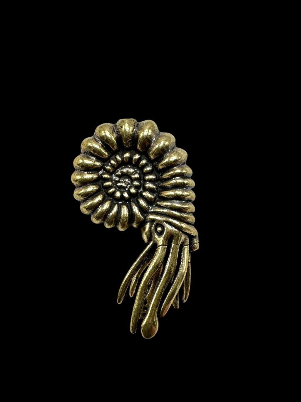 Poznámka: Tento mosazný amonitnení přírodním minerálem ani kamenem. Jedná se o dekorativní předmět – kovovou maketu, která nemá geologický ani paleontologický původ a neslouží jako fosilie.