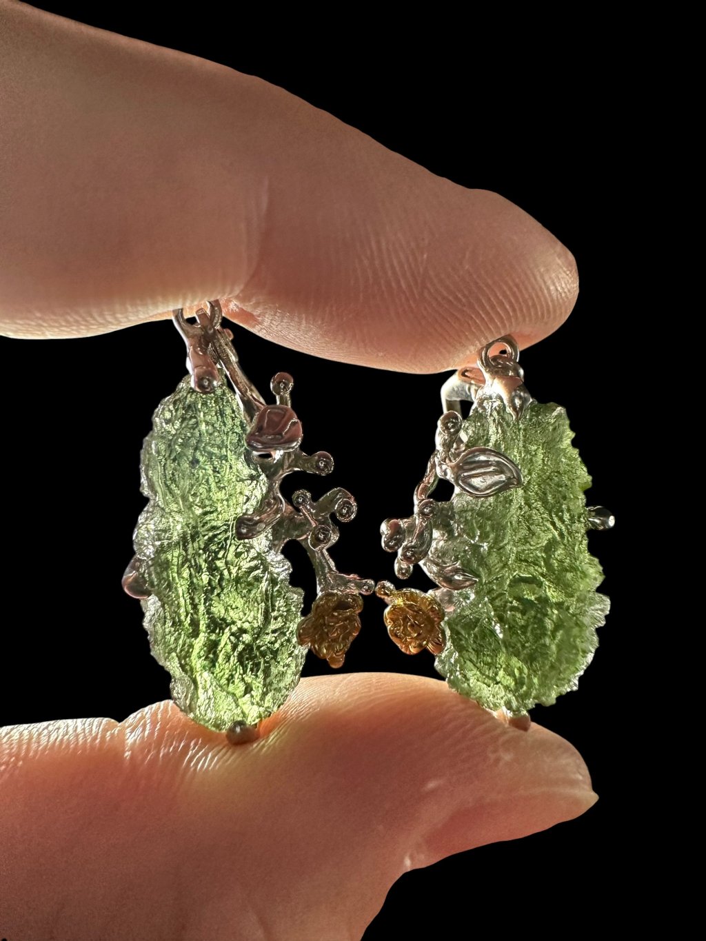 Stříbrné vltavínové náušnice s pozlacenými prvky 10,4g