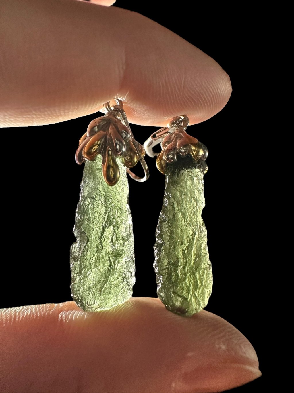 Stříbrné vltavínové náušnice s pozlacenými prvky 8g