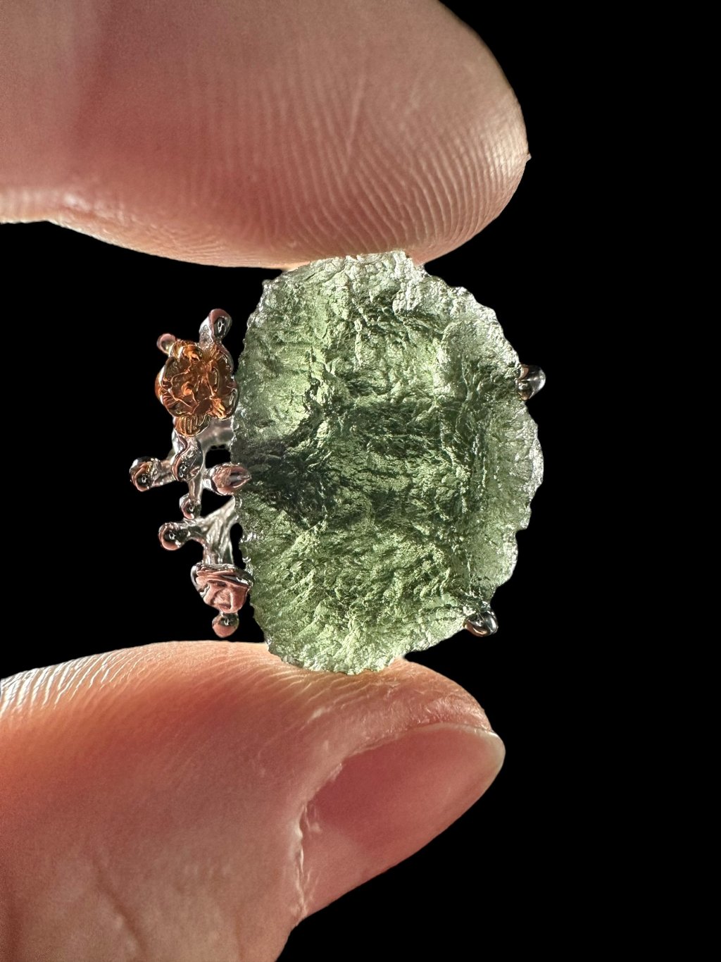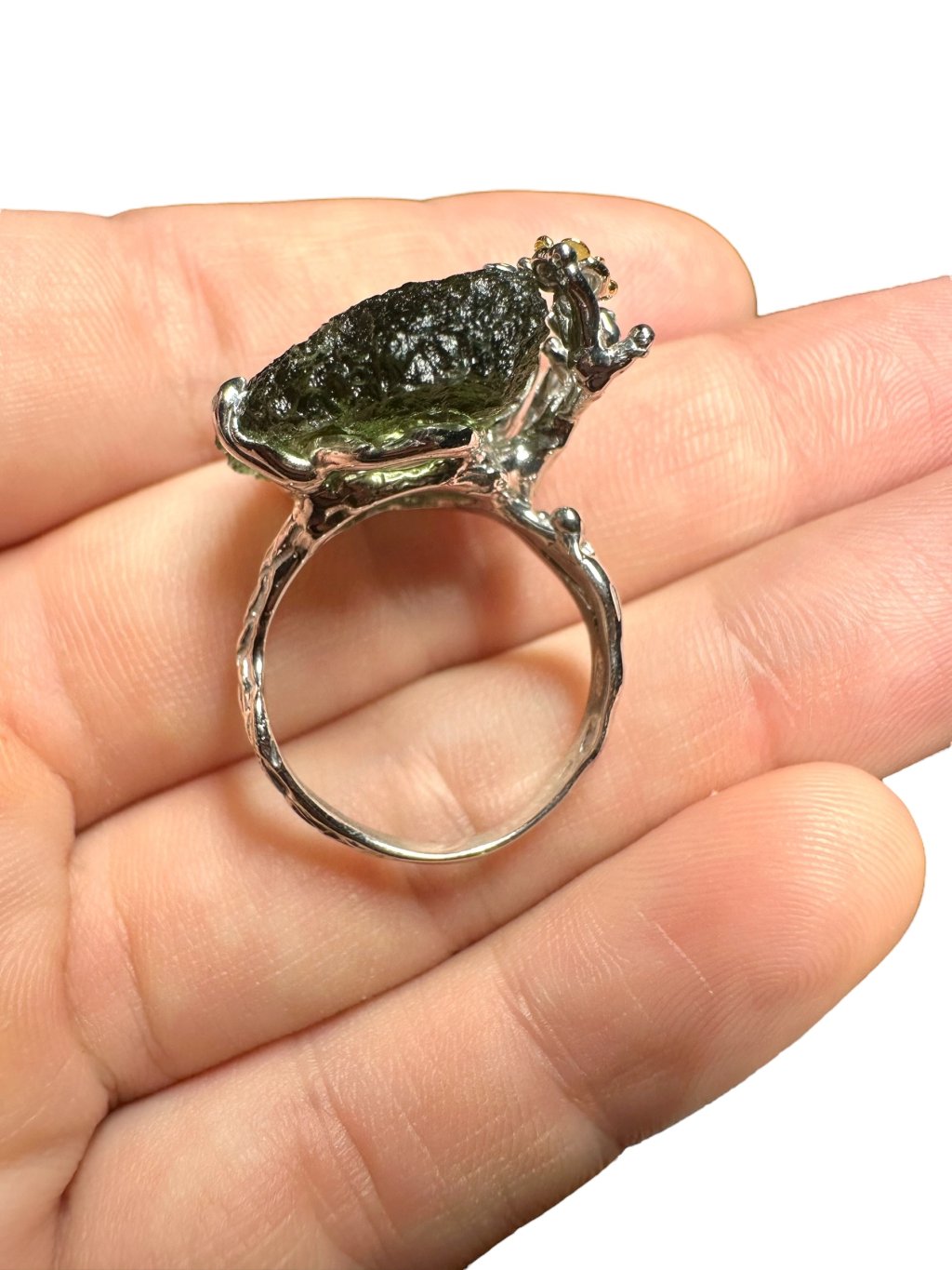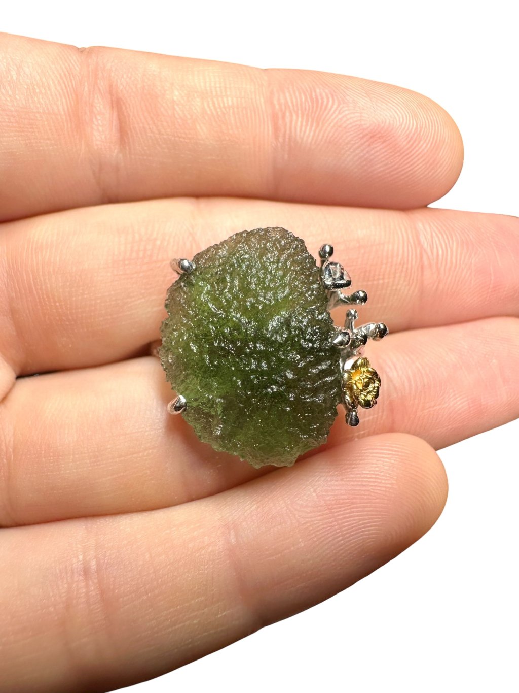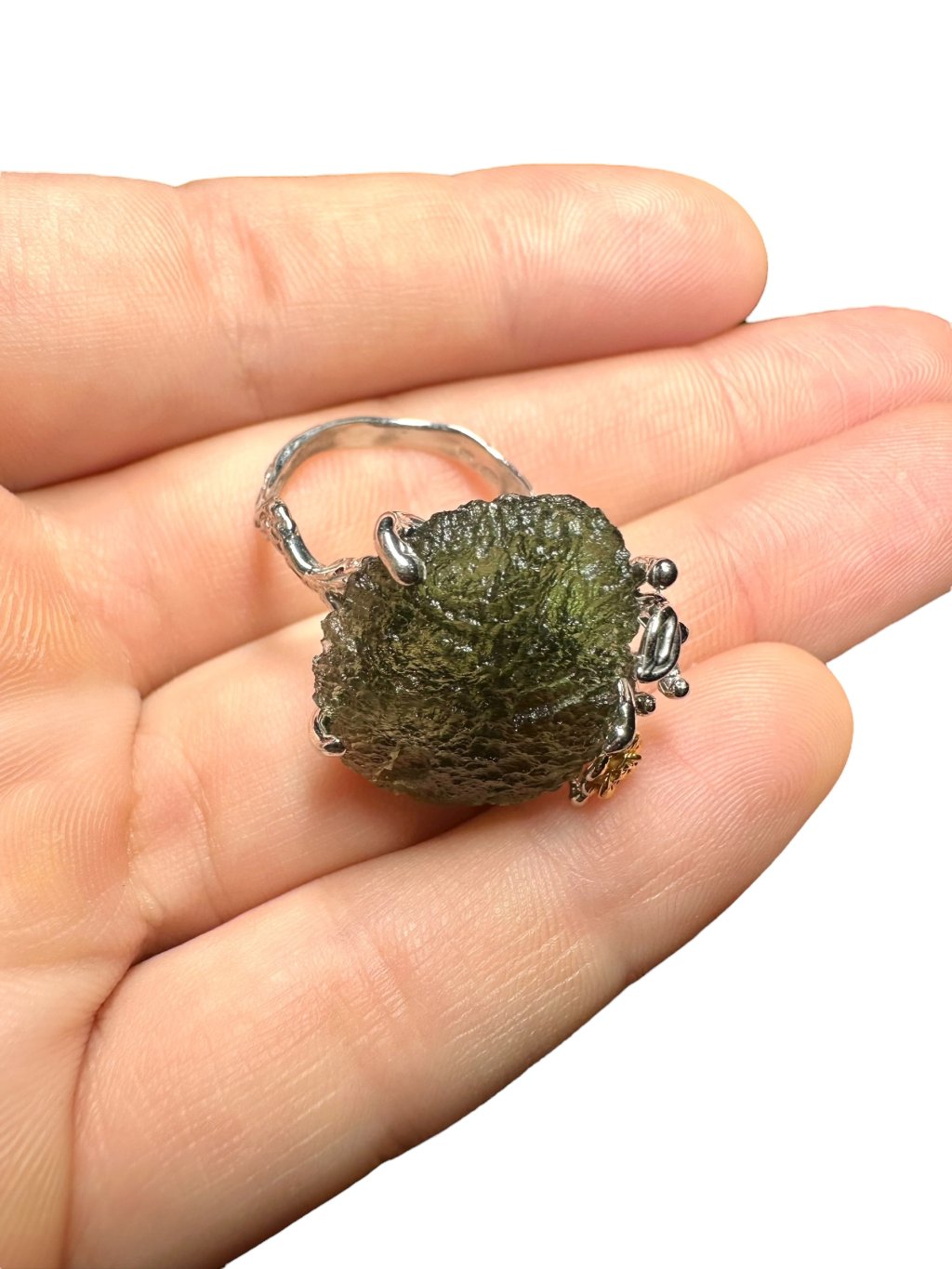 Stříbrný prsten s vltavínem s pozlacenými prvky 8g