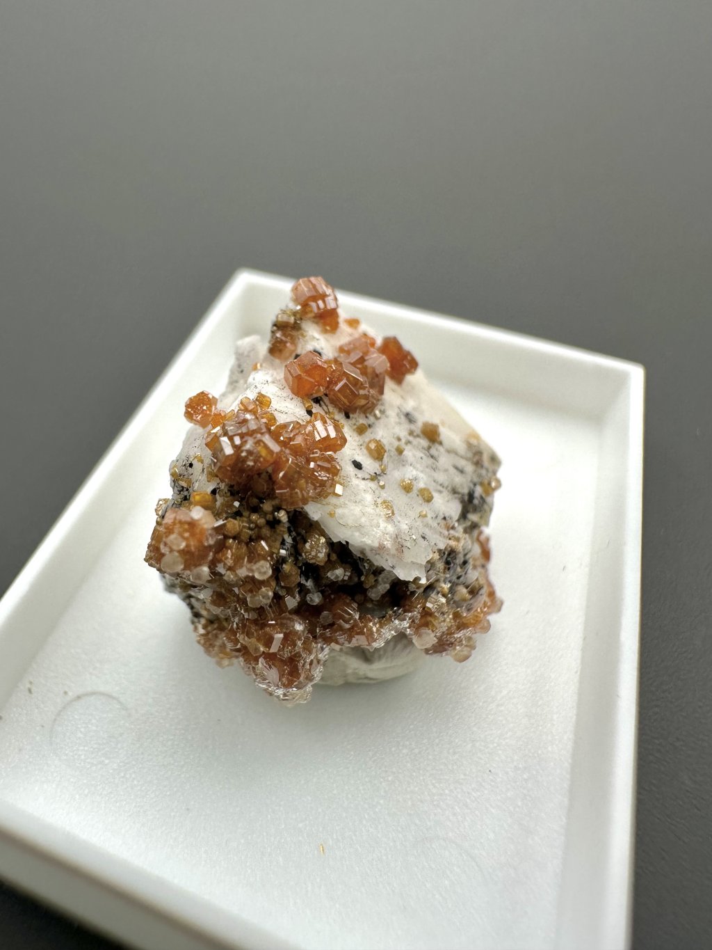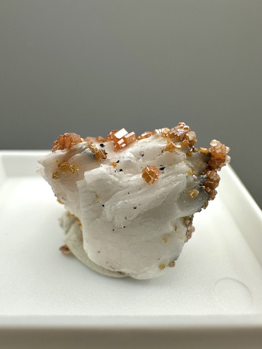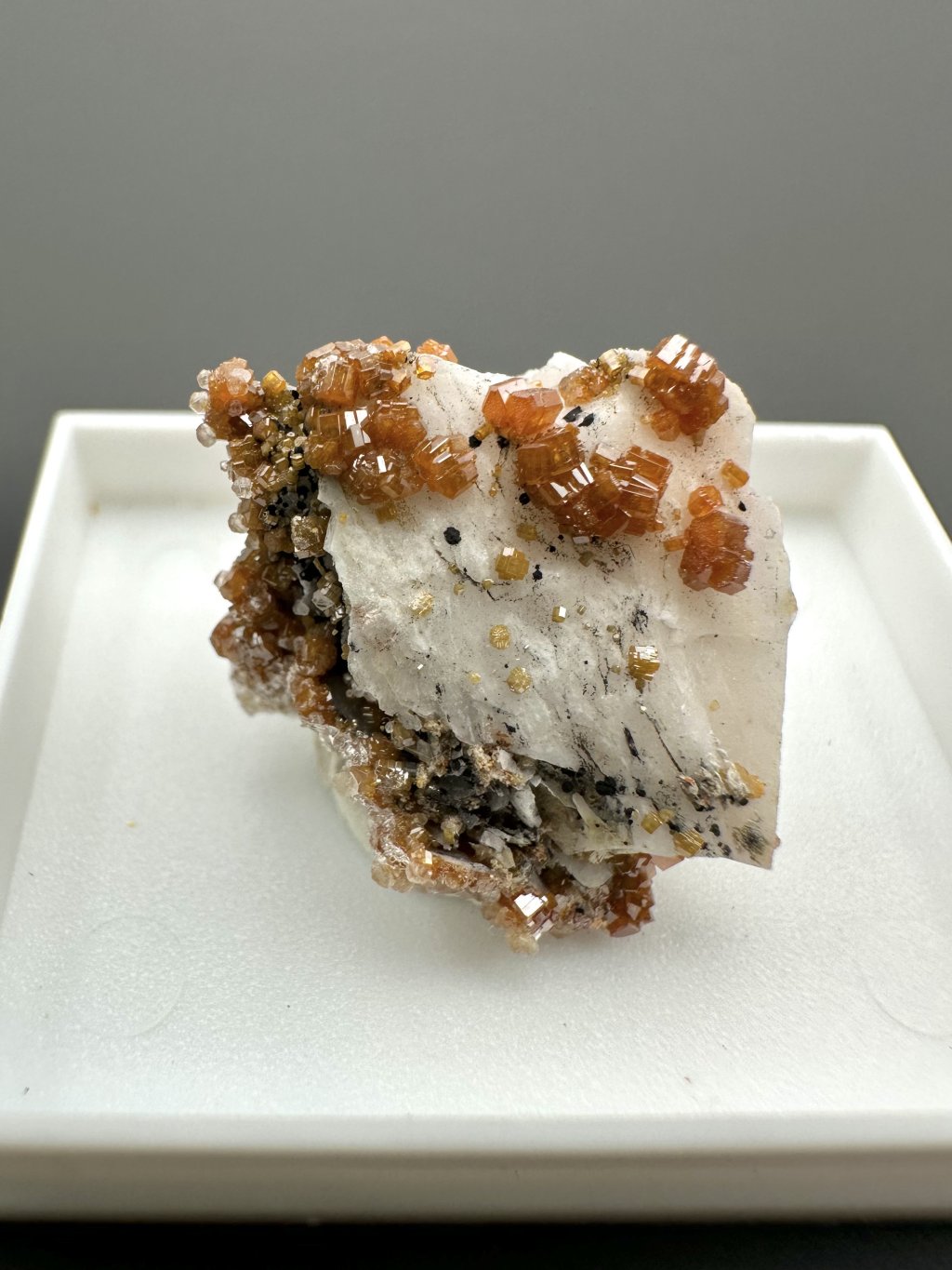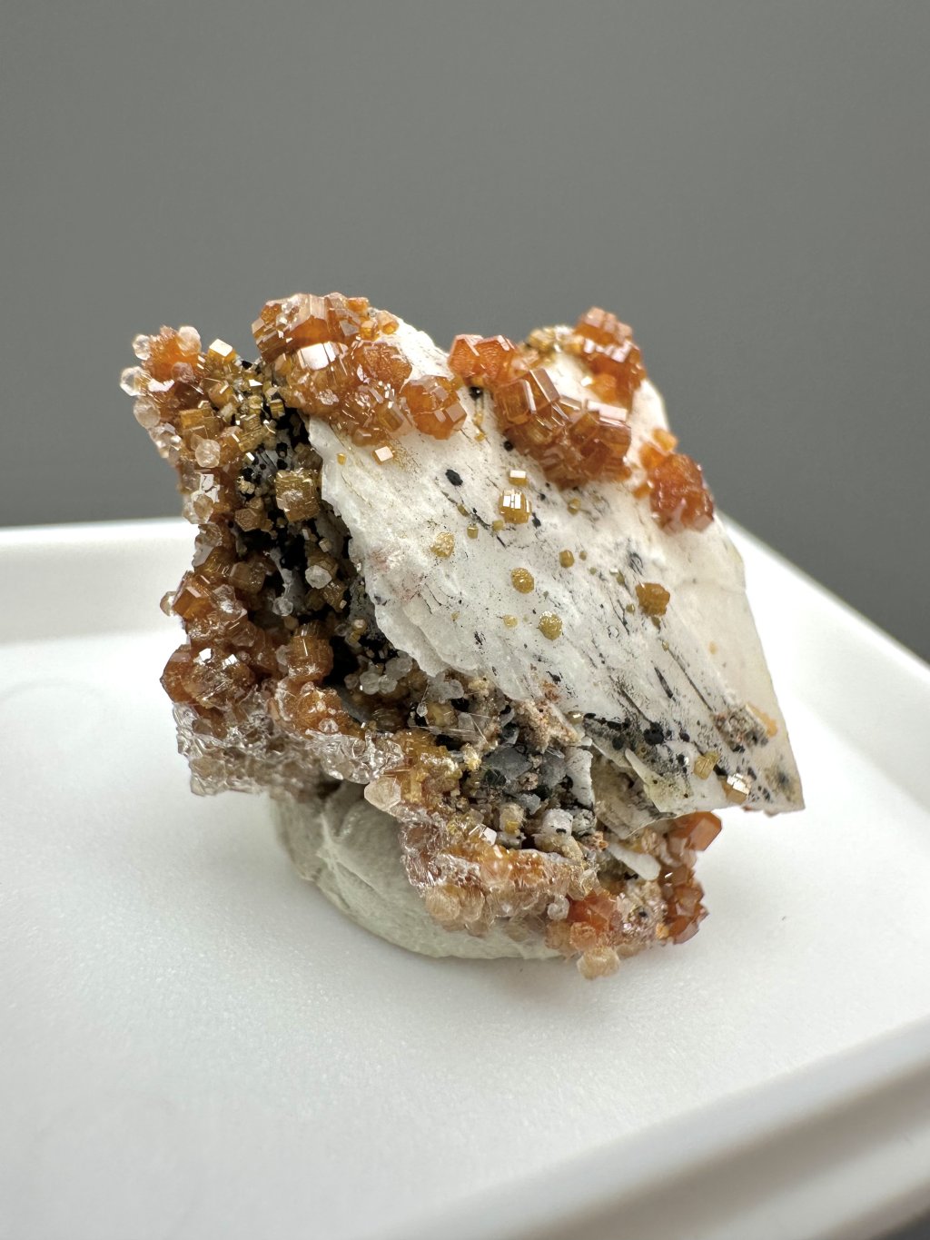 Vanadinit často tvoří nádherné kompozice s barytem, což vytváří velmi estetické sběratelské vzorky. V některých případech může být baryt, který je obvykle bílý nebo nažloutlý, pokrytý manganovými solemi. Manganové soli dodávají barytu tmavě hnědé až černé odstíny, což vytváří kontrast s krystaly vanadinitu. Tyto krystaly se typicky vyskytují v jasně červené nebo oranžové barvě, čímž vzniká vizuálně atraktivní kombinace