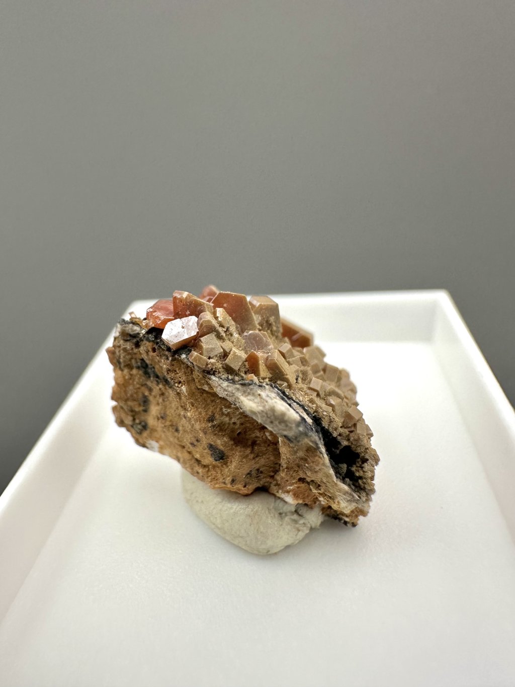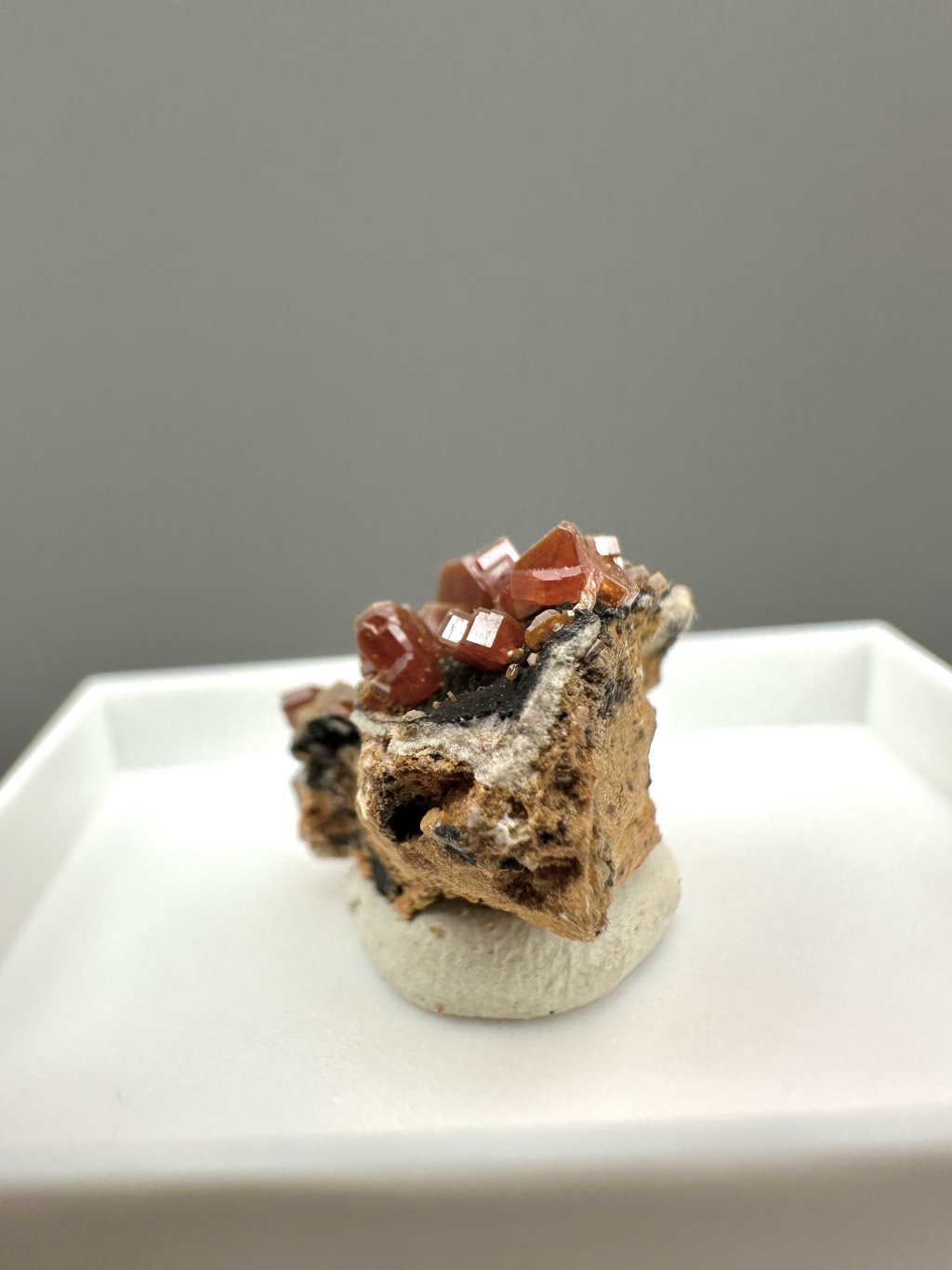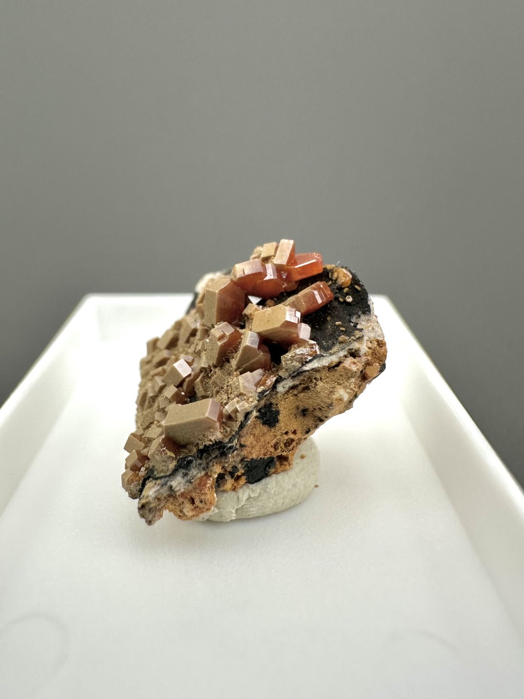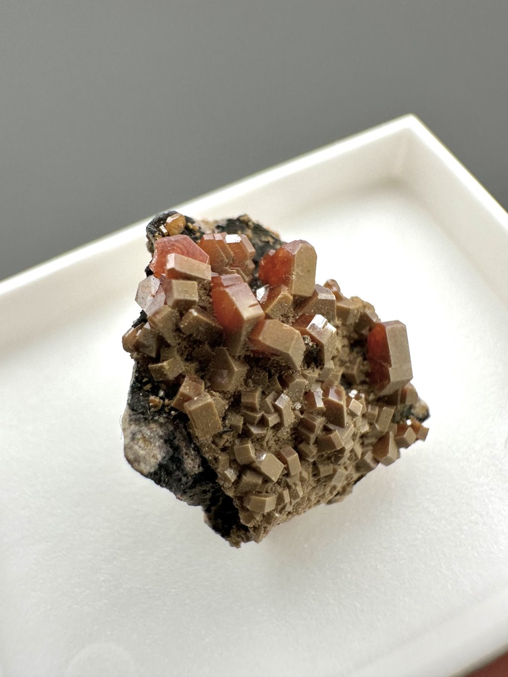 Vanadinit často tvoří nádherné kompozice s barytem, což vytváří velmi estetické sběratelské vzorky. V některých případech může být baryt, který je obvykle bílý nebo nažloutlý, pokrytý manganovými solemi. Manganové soli dodávají barytu tmavě hnědé až černé odstíny, což vytváří kontrast s krystaly vanadinitu. Tyto krystaly se typicky vyskytují v jasně červené nebo oranžové barvě, čímž vzniká vizuálně atraktivní kombinace