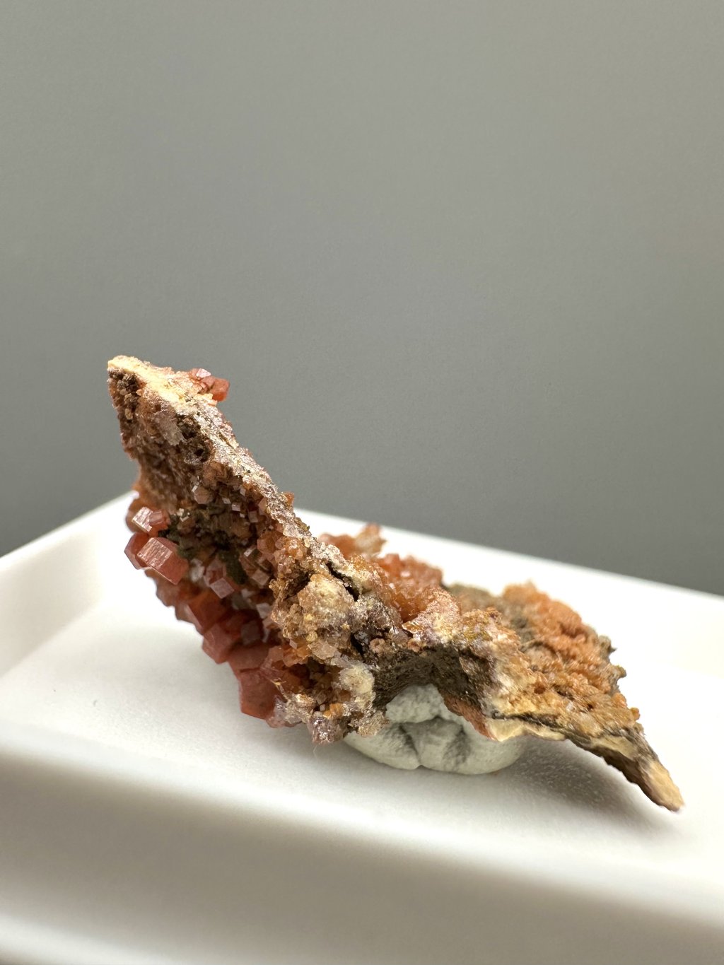 Vanadinit má chemický vzorec Pb₅(VO₄)₃Cl a jeho základní složky jsou olovo, vanad a chlor. Obsahuje také menší množství fosforu a arsenu, které mohou částečně nahradit vanad v jeho struktuře. Typicky se vyskytuje v odstínech červené, oranžové, hnědé a někdy i žluté. Barva závisí na obsahu vanadu a stopových prvků v minerálu. Vanadinit tvoří šestiboké (hexagonální) krystaly, které jsou často dokonale vyvinuté. Může vytvářet také stébelnaté, zrnité či masivní agregáty. Krystaly vanadinitu mají vysoký skelný až diamantový lesk, což přispívá k jejich atraktivnímu vzhledu a oblíbenosti mezi sběrateli minerálů.