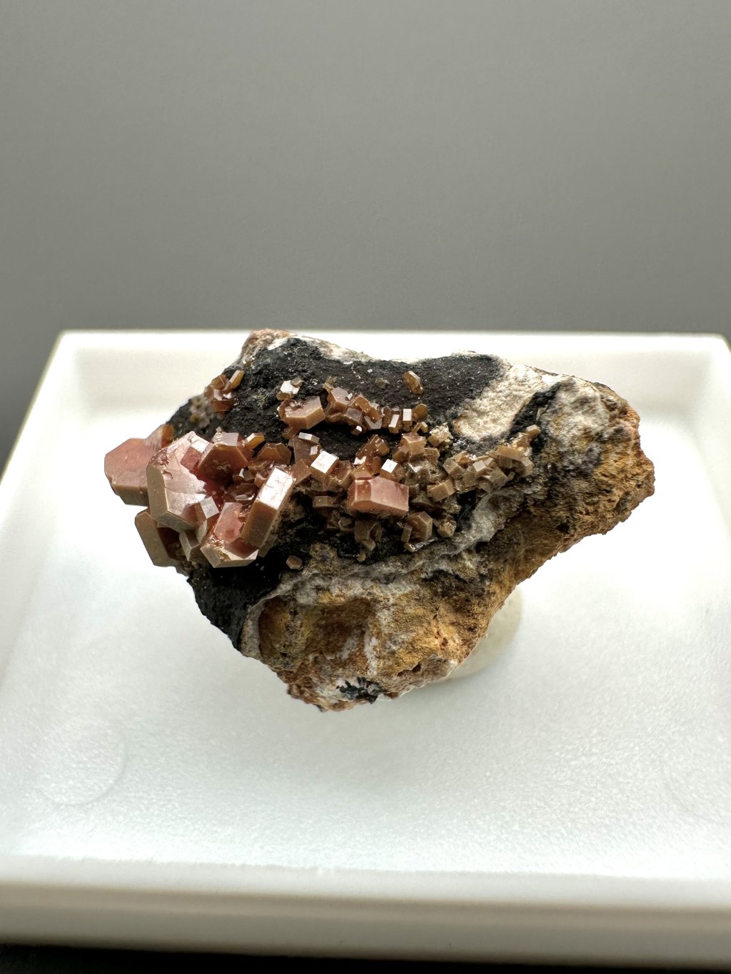 Vanadinit často tvoří nádherné kompozice s barytem, což vytváří velmi estetické sběratelské vzorky. V některých případech může být baryt, který je obvykle bílý nebo nažloutlý, pokrytý manganovými solemi. Manganové soli dodávají barytu tmavě hnědé až černé odstíny, což vytváří kontrast s krystaly vanadinitu. Tyto krystaly se typicky vyskytují v jasně červené nebo oranžové barvě, čímž vzniká vizuálně atraktivní kombinace