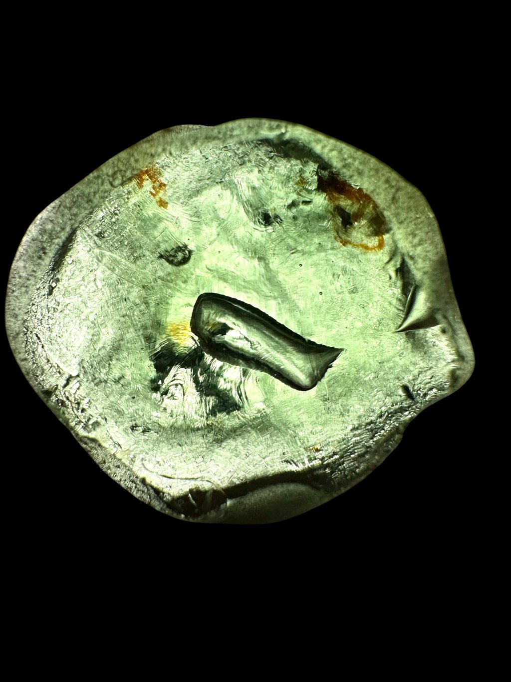 Řez vltavínem s uzavřenou bublinou. Apple green barva.