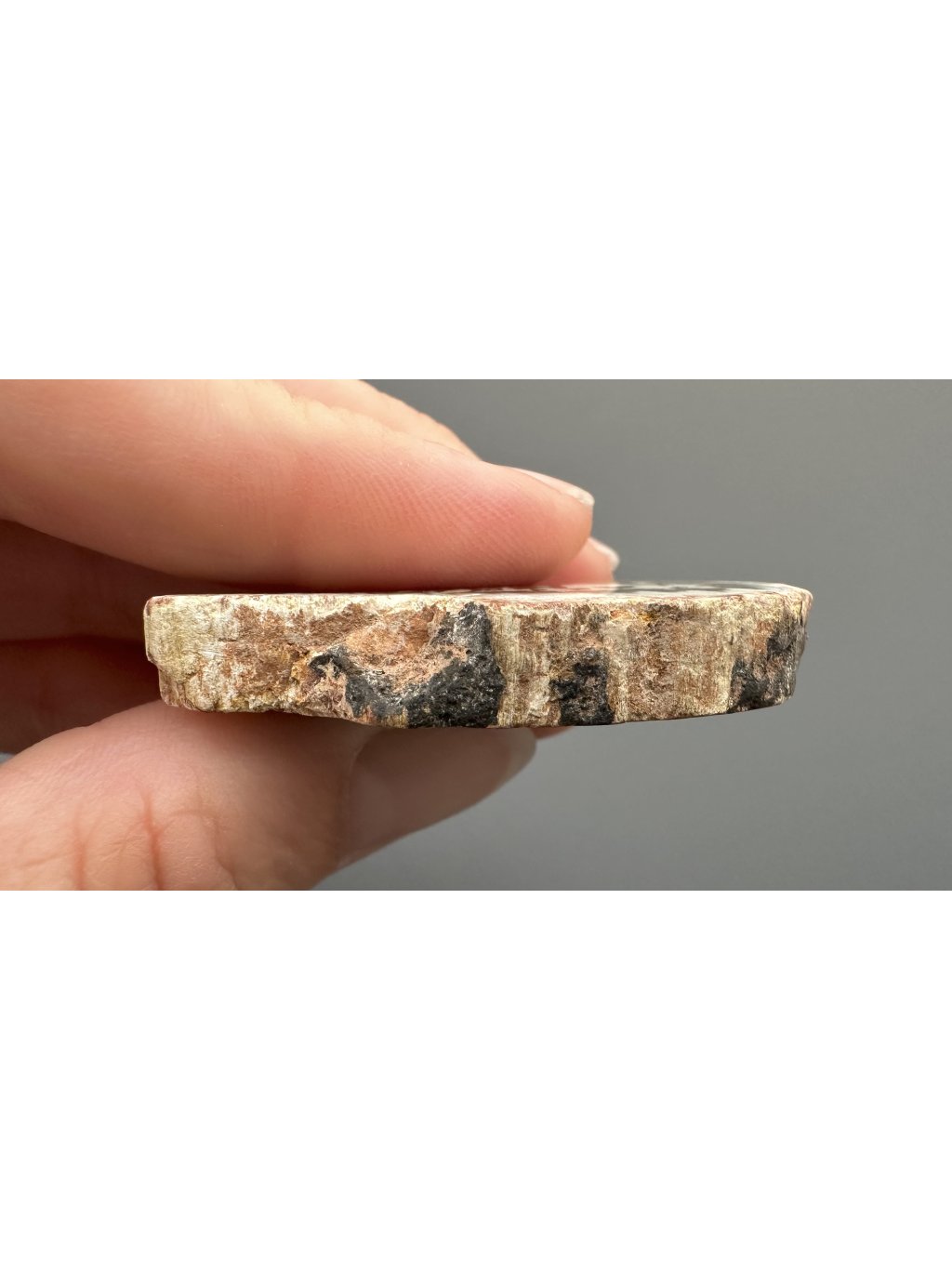 Povrchová úprava: oboustranně leštěný plátek (struktura kůry po obvodu je zachována)